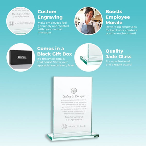 The Jade Character Trophy Collection takes value to a new level. Each trophy in the collection is made from jade glass, creating a stunning blueish-green hue. Designed to stand alone or work together as a comprehensive award suite, the trophies in this collection can be personalized with laser engraving and are delivered in a protective white box.