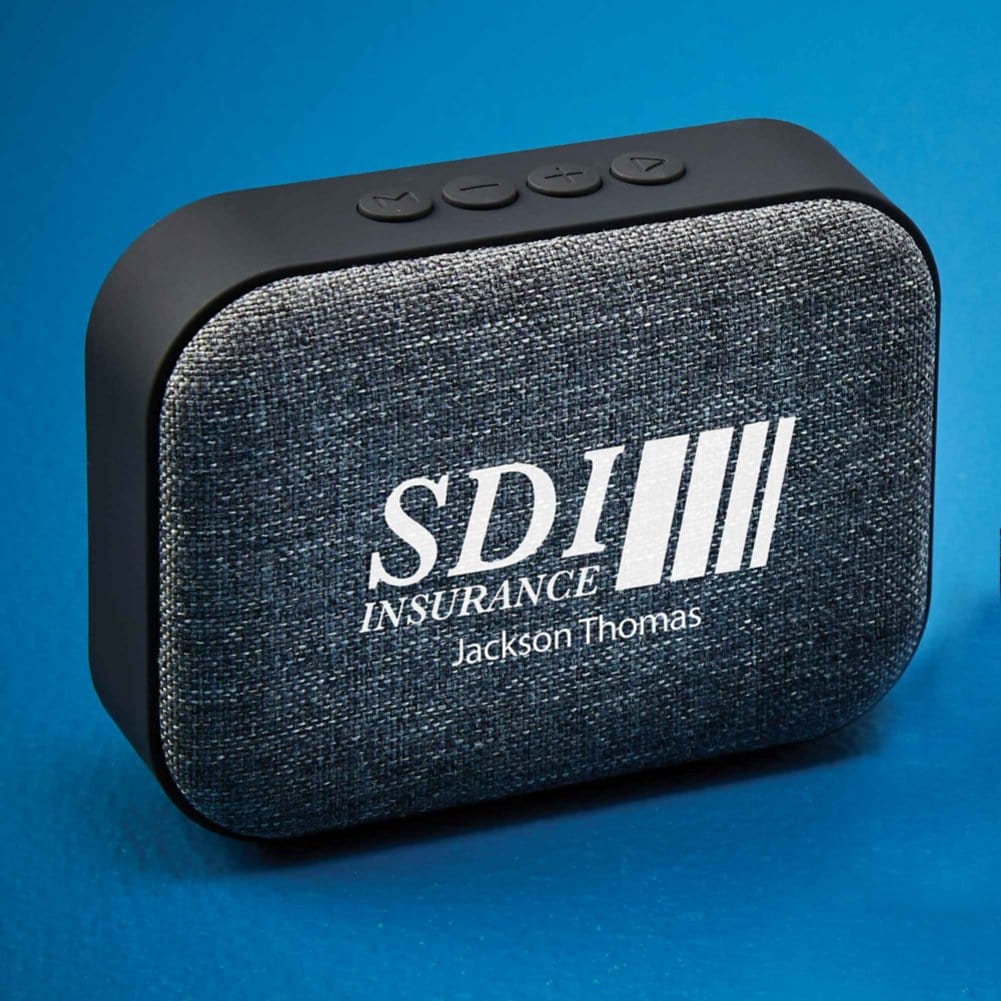 Keep the tunes going with this fabric covered speaker. With 4 hours of play time and a charging cable included, you can keep the party going all day long. This speaker can pair up to any capable device within 32 feet away. Make it fully unique with exclusive art of your choice and personalization! View over 100 exclusive art options by clicking through the product images or downloading our easy-view Exclusive Art Guide in the link under details & specifications.
