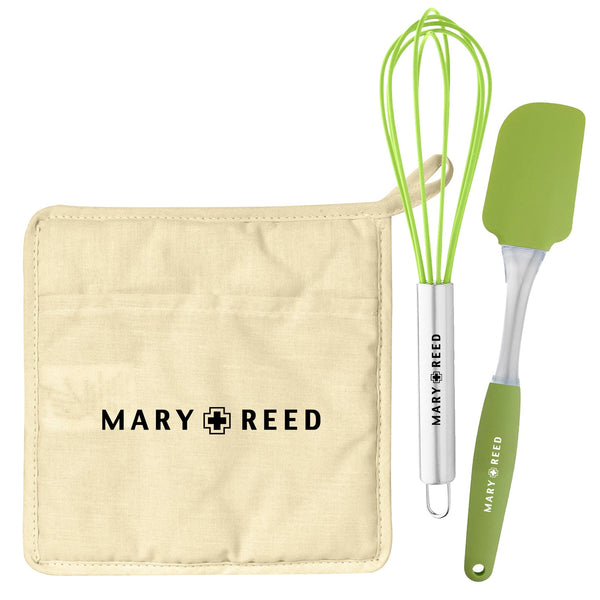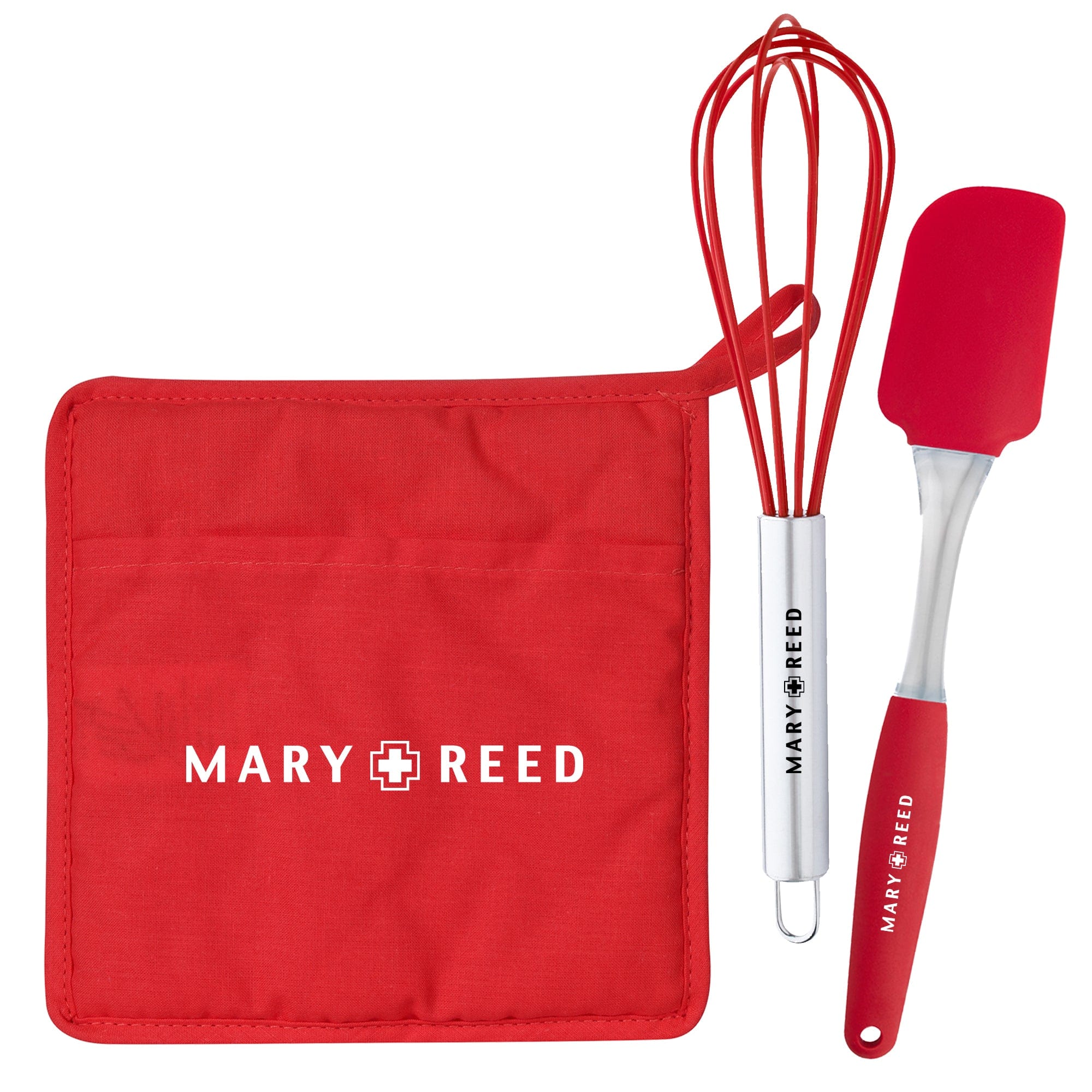 Featuring a pot holder, a spatula, and a whisk, the Baking Basics Gift Set is perfect for your office foodies! Add your logo to increase brand visibility and pair with a box cake mix for an extra sweet employee appreciation gift.