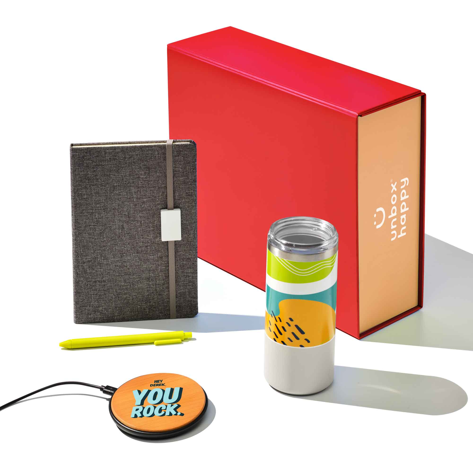At Delightly, we understand the value of a happy and motivated team. That's why we've created the 'Happy You're Our Coworker' Kit, hand-picked to make your team members feel not only welcomed but truly appreciated. With this carefully curated kit, you'll set them up for success and let them know just how awesome they are! What's Included: 16 oz Stainless Steel Tumbler, U Brands Felt Journal, Qi Charger, Gel Pen This versatile gift is perfect for various occasions, including onboarding, work anniversaries, promotions, client appreciation, saying thank you, or simply brightening someone's day. The 'Happy You're Our Coworker' Kit is a symbol of your recognition and a warm welcome to the team. Delightly ensures that every kit is expertly curated and features hand-selected items of the highest quality. We take pride in our attention to detail, so you can be confident that your gift will make a lasting impression. We’re good at thinking outside the box. Due to high demand and quick turnover, box color is not guaranteed. If the pictured box color is unavailable, an alternate will be substituted to avoid shipment delays! Order before 3pm EST and your kit ships same day! Want to send multiple gifts to different addresses? We’re here to help! Give us a call at 1.800.728.0888 or email us at service@baudville.com.