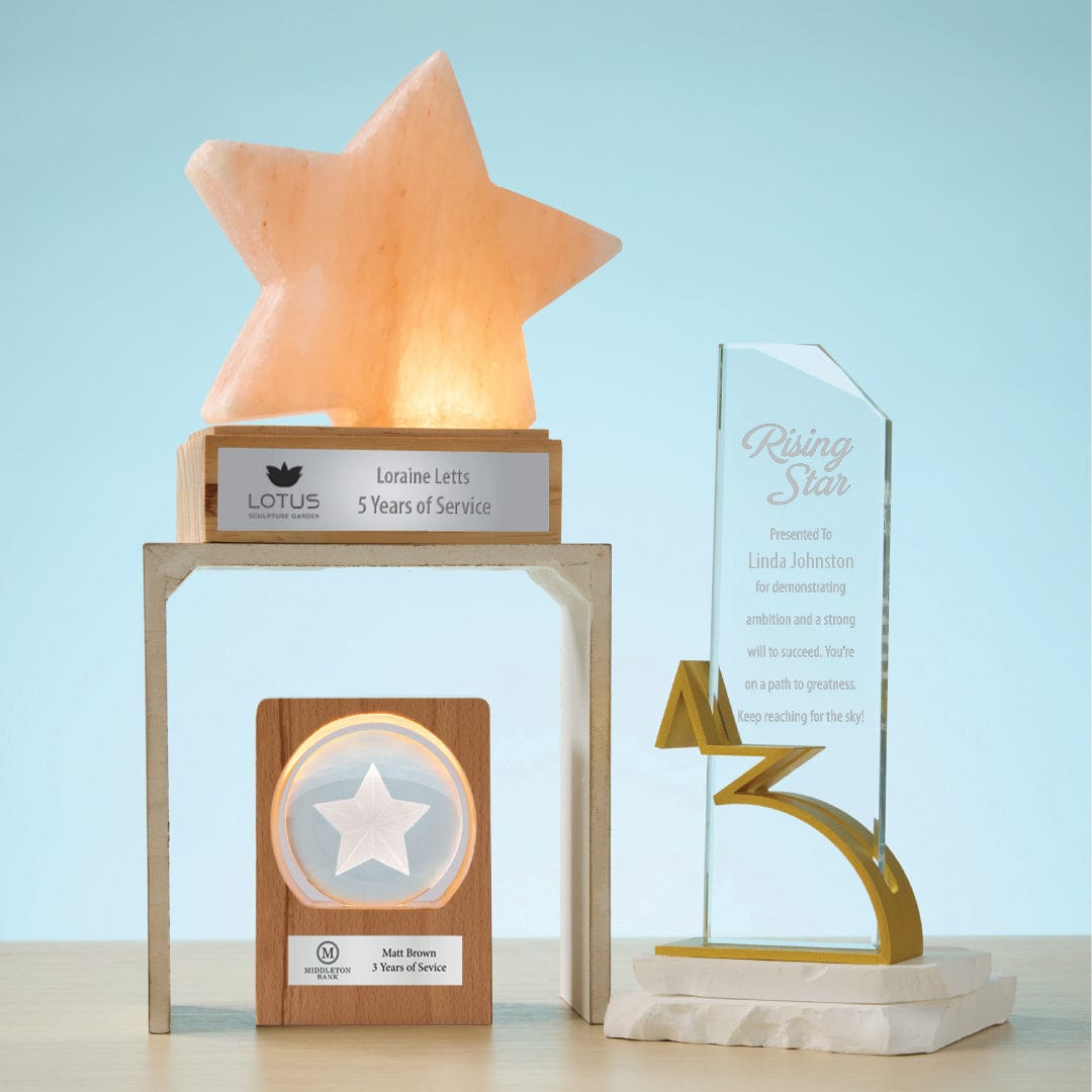 The 3D Etched Glowing Globe Award - Star is more than a trophy—it’s a luminous celebration of success. Featuring a glass sphere with a 3D-etched star design, this piece shines as a symbol of brilliance and achievement. Resting on a bamboo base with built-in lighting, it doubles as a glowing work of art. Perfect for corporate awards, it fits year-end celebrations or milestone recognition. The base can be customized with your logo, text, or artwork, turning it into one of the most memorable acrylic corporate awards available. This unique corporate award arrives in a Baudville Exclusive display box, ready to make any recognition event unforgettable.