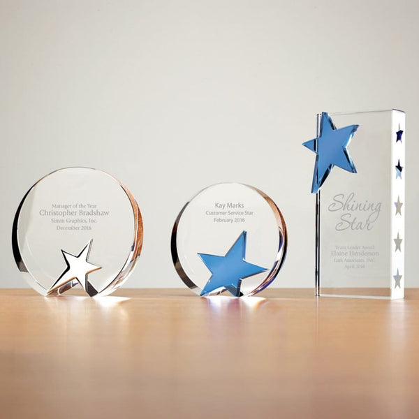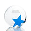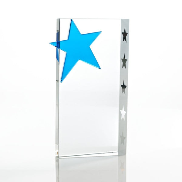 This 4 x 8" tall crystal trophy with blue star accent makes a stunning award for their desktop. Small stars run down the frosted right...