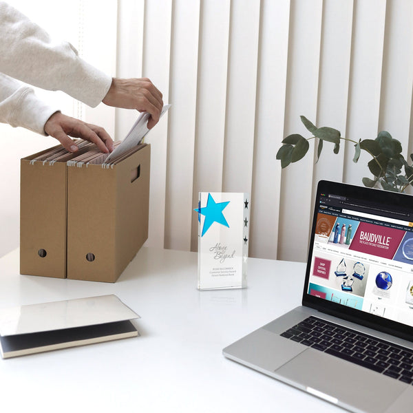 This 4 x 8" tall crystal trophy with blue star accent makes a stunning award for their desktop. Small stars run down the frosted right side, for added interest. Price includes choice of graphic titles and up to four lines of personalization.
