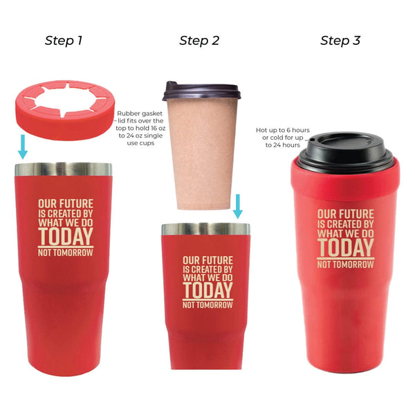 Plus, when not being used with a single-use cup, this tumbler functions as a conventional 30 oz tumbler with a spill-proof drinking lid. Designed to fit comfortably in standard cup holders, it's perfect for any commute or adventure.