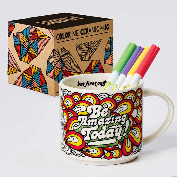 Unleash your creativity with the DIY Color Me Artisan Mug - Be Amazing! This interactive, fun-filled mug set transforms your coffee routine into a canvas for self-expression. With its black-and-white design and the inspiring message “Be Amazing Today!” on the outside, this 14 oz mug comes with 5 vibrant markers in green, red, purple, blue, and yellow—everything you need to create a one-of-a-kind masterpiece.
