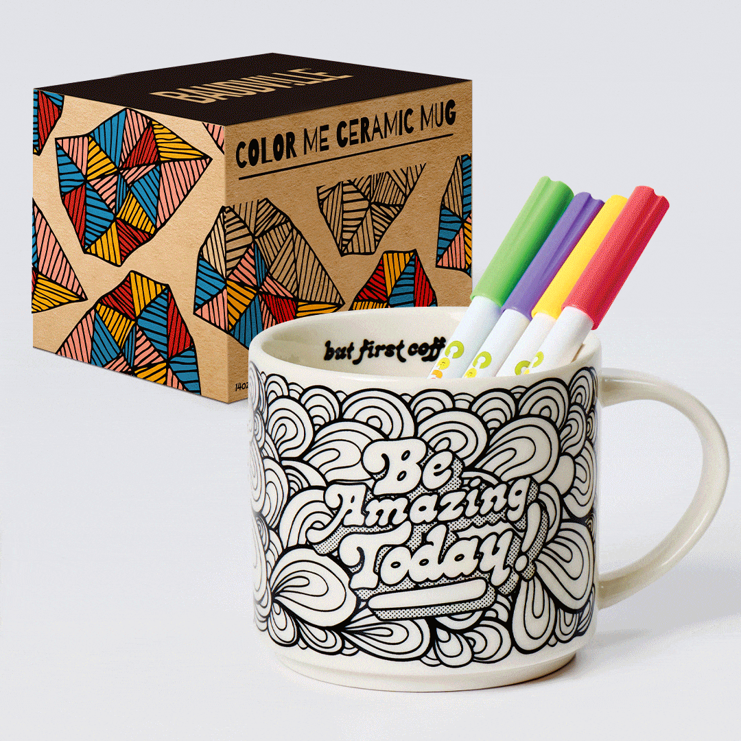 After you’ve colored your mug just the way you want it, simply let the ink dry, bake it, and cool it down to reveal your completely unique, drink-safe creation. But the fun doesn’t stop there! The inside rim of the mug features the playful phrase “But first, coffee,” adding an extra touch of humor to your morning routine.