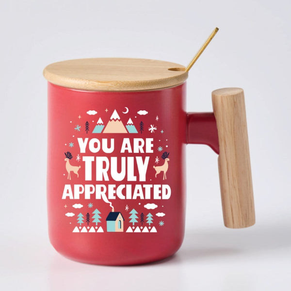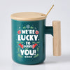 Celebrate your team's value with the Festive Nordic Mug Gift Set - Lucky to Have You, a stunning fusion of modern design and rustic charm that will be the highlight of your office holiday celebration. This deep green mug, crafted from high-quality ceramic, features the heartfelt message, "We're lucky to have you." It comes complete with a wooden handle, a matching wooden lid, and a golden spoon—making it both functional and stylish.