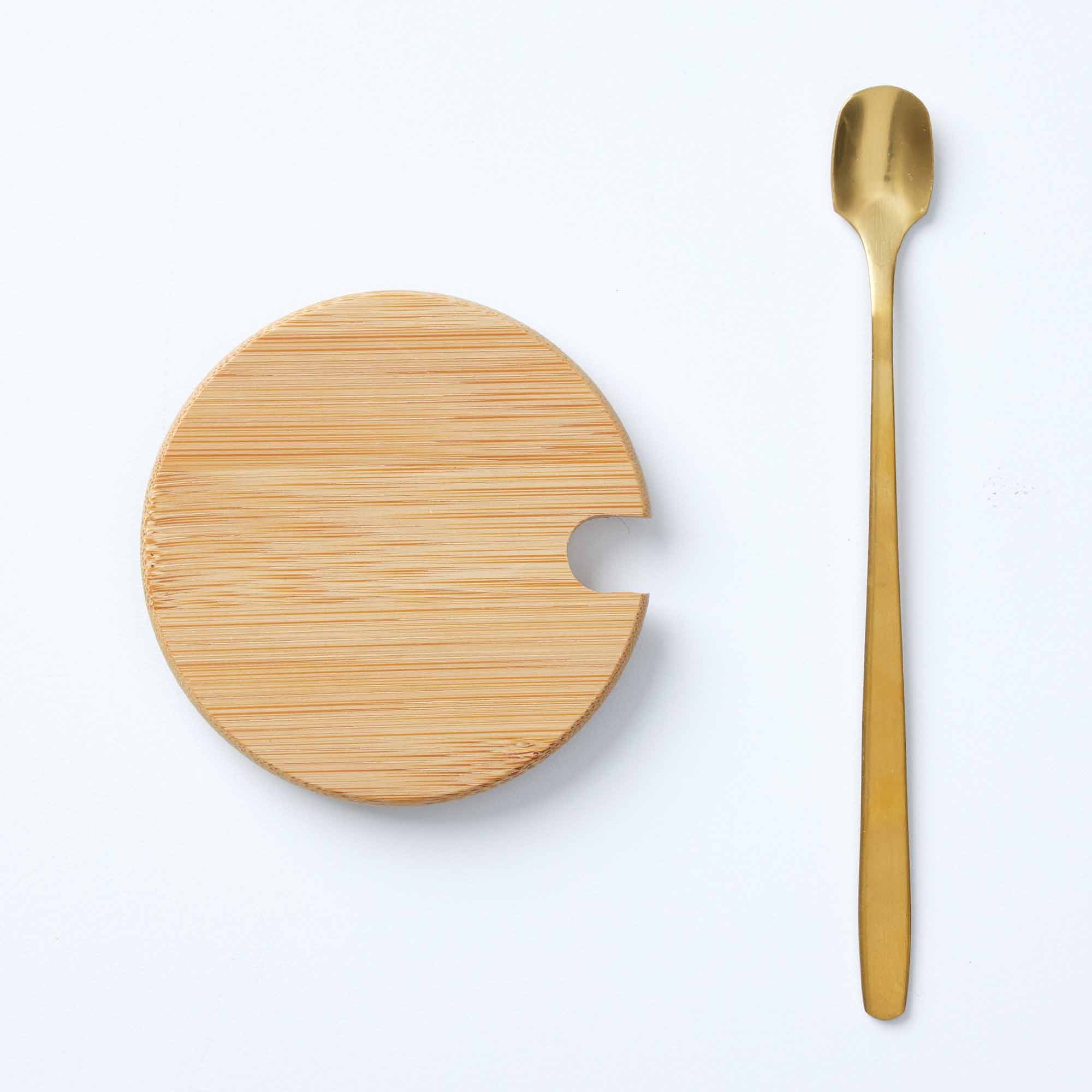 - Ceramic mug set comes with a wooden handle, lid, and golden spoon