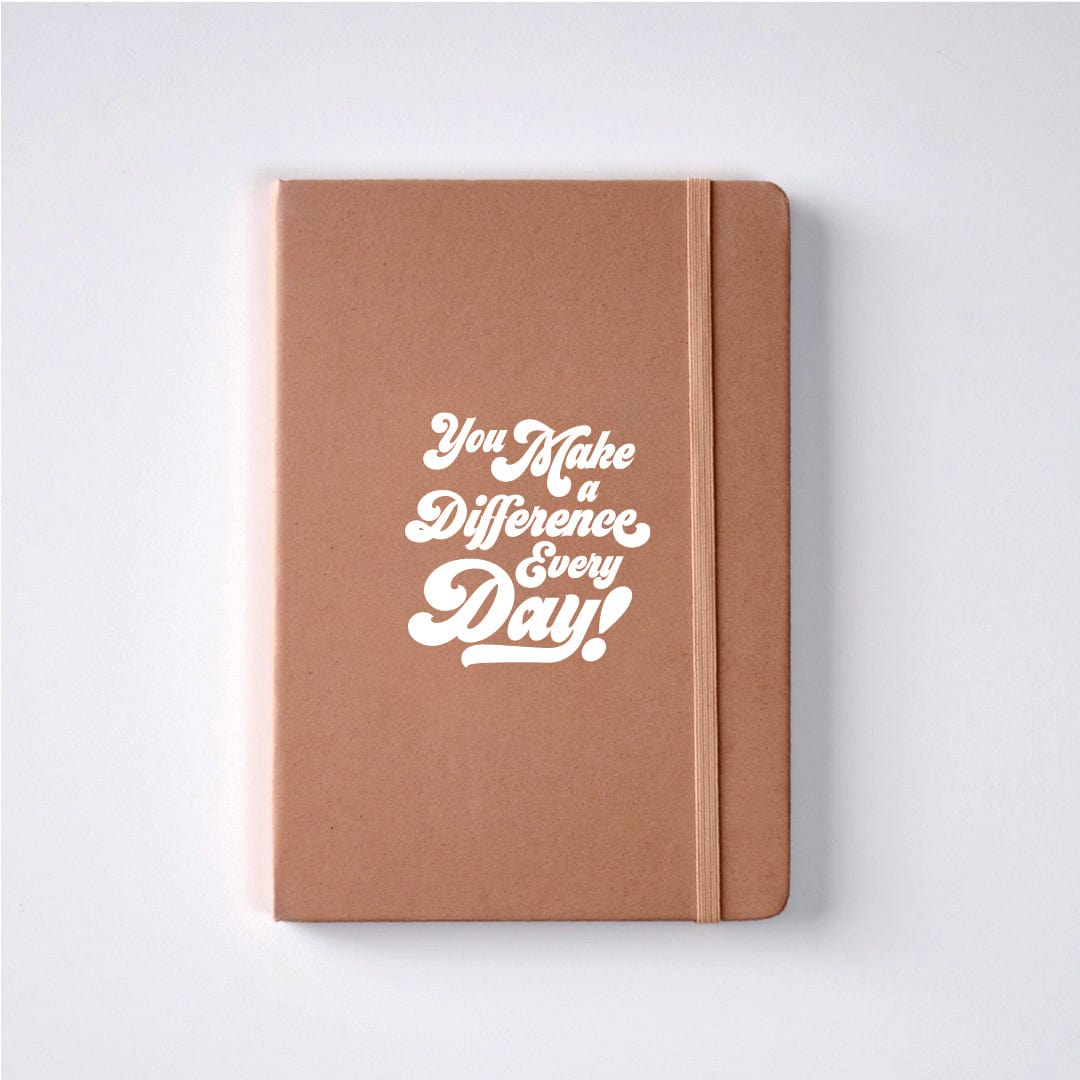 The notebook’s perfect bound binding and elastic band closure ensure your notes stay secure and organized, while its vibrant pink cover features a Baudville Exclusive design with the uplifting message: "You Make a Difference Every Day!"