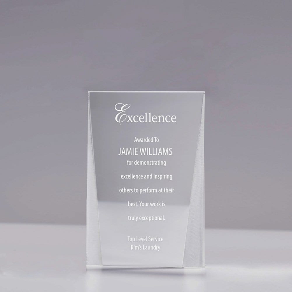 This is a top-quality trophy at a top-quality value. Made from crystal clear acrylic and featuring three lines of personalization, it's a stunning award for top performing employees and exceptional team members. Personalization is engraved onto the acrylic from the back, resulting in a beautiful and ultra-personal final product. Delivered in an elegant gift box, it's a custom showstopper for any desktop display.