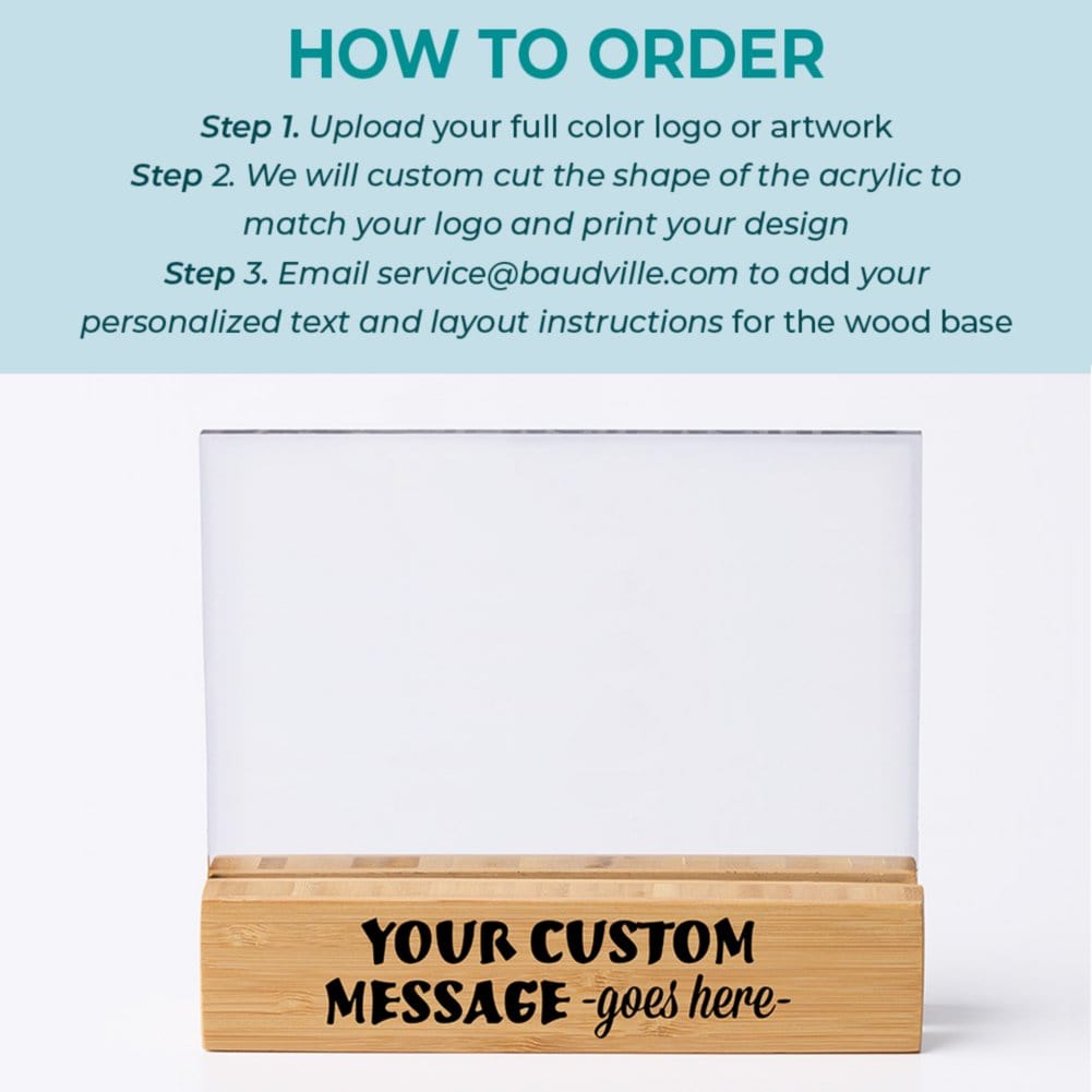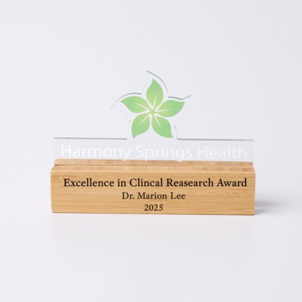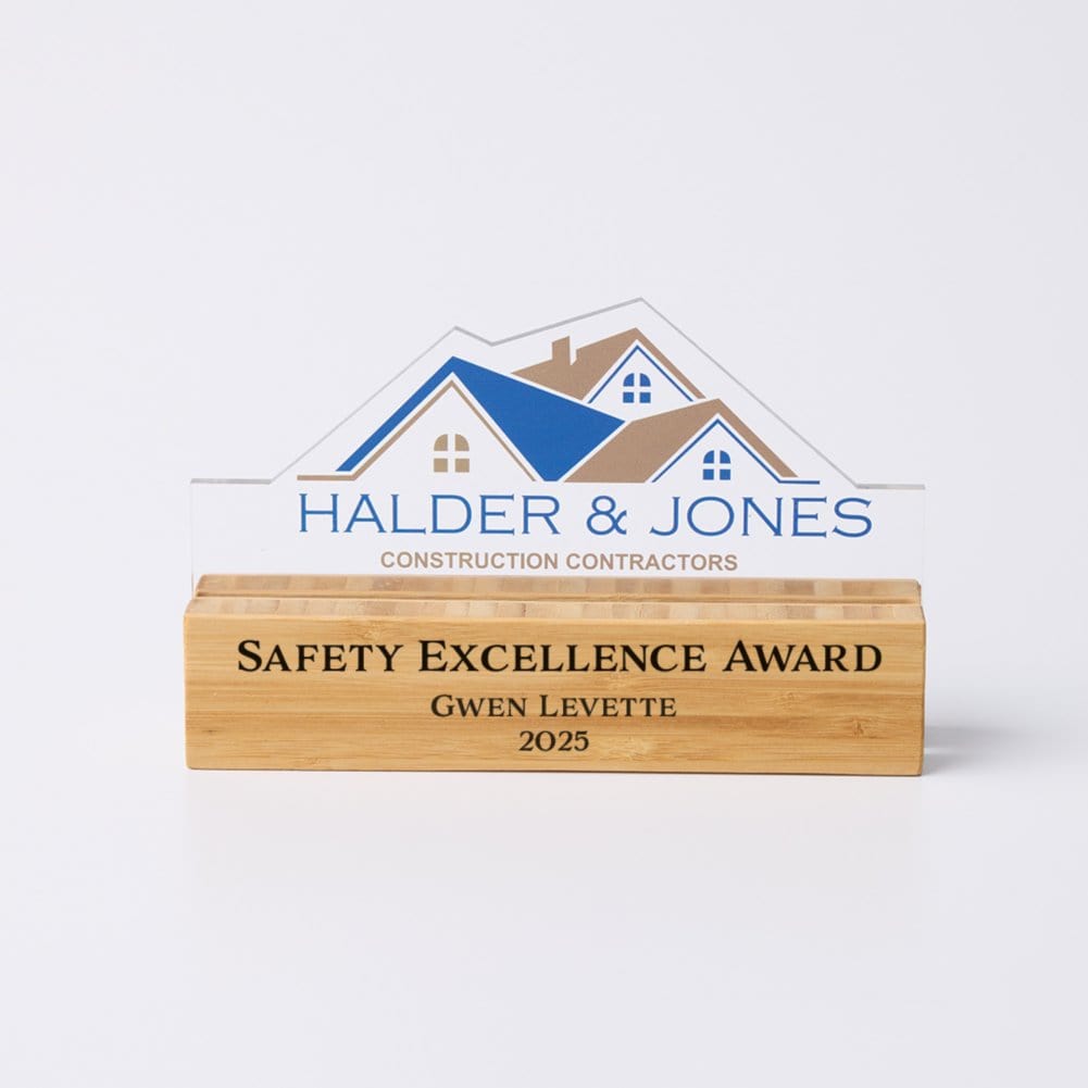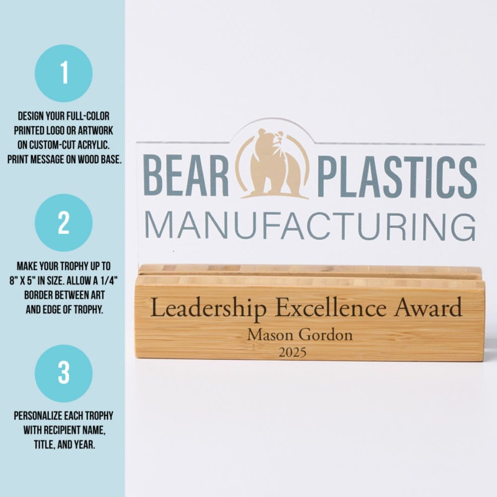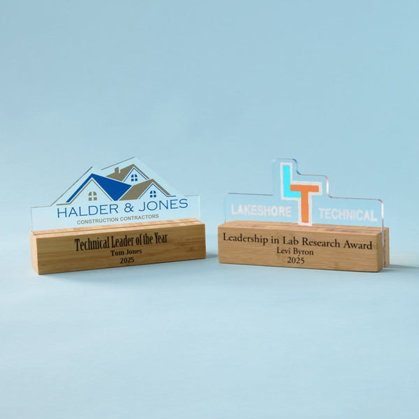 Make your recognition as unique as the achievement itself with the Design It! Custom Acrylic & Wood Award. This premium award features a fully customizable 8x5 acrylic top, precision-cut to your design, and a natural wood base that can be engraved with personalized text. Whether you're celebrating corporate excellence, employee milestones, or special achievements, this modern and professional award delivers a standout presentation. With full-color printing on the acrylic and laser engraving on the wood, you can create a one-of-a-kind keepsake that leaves a lasting impression.