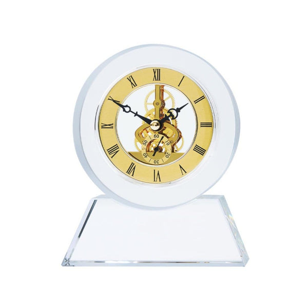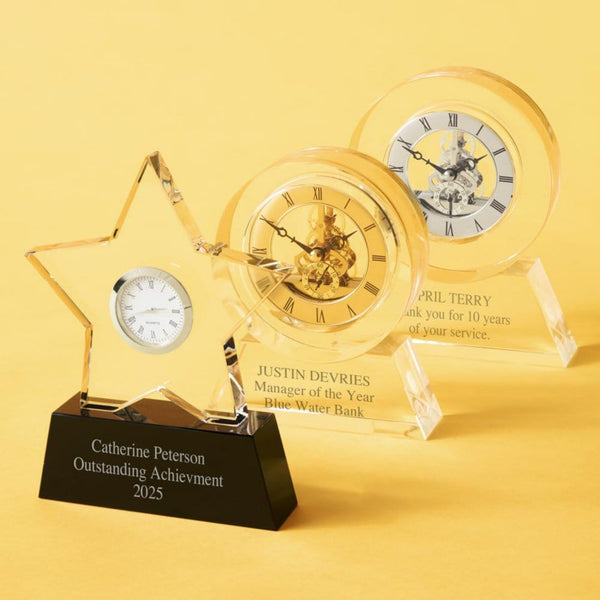 This stunning crystal clock combines sophisticated design with functional beauty, making it the perfect custom trophy for recognizing outstanding achievements. Crafted from premium crystal with a precision gold timepiece, this milestone award serves as both a practical desk accessory and a meaningful keepsake. The combination of crystal clarity and high-end gold placements creates an award that recipients will proudly display for years to come. Unlike traditional trophies, this functional timepiece serves as a daily reminder of their achievement while adding elegance to any office or home setting.