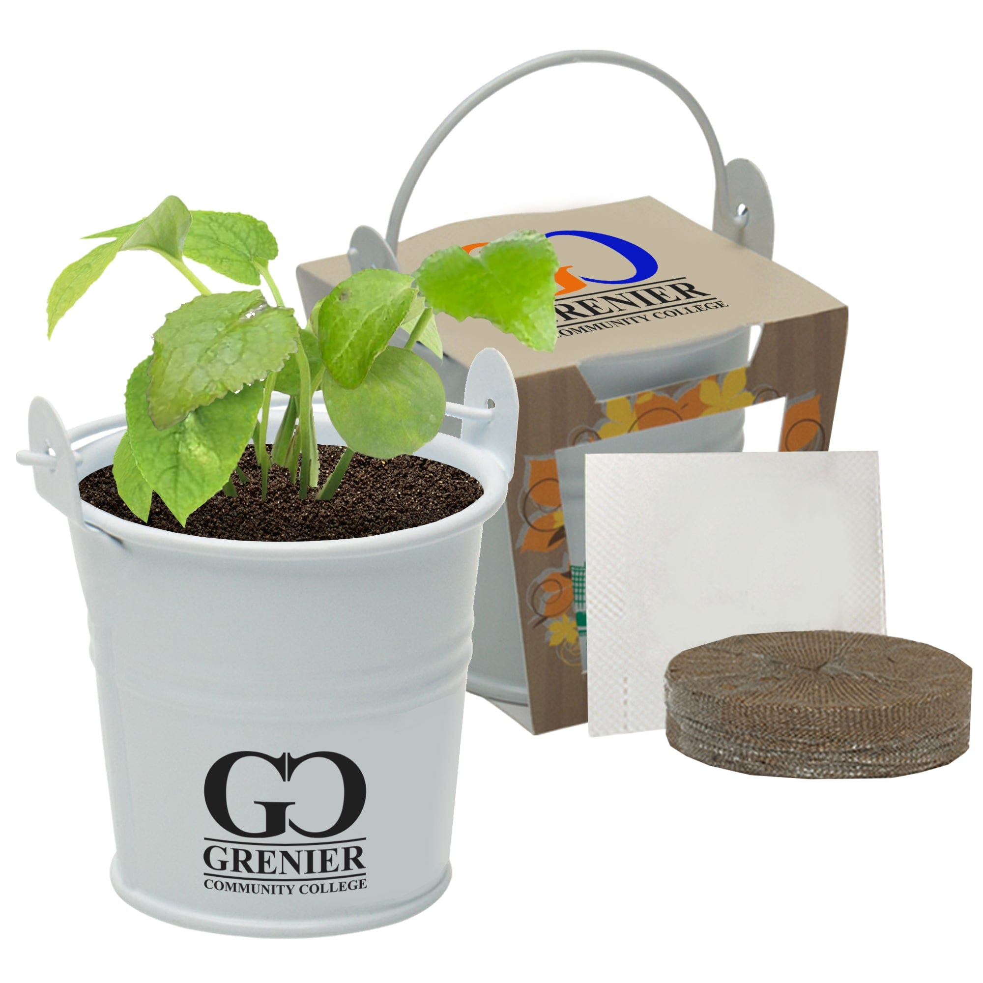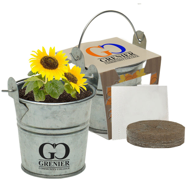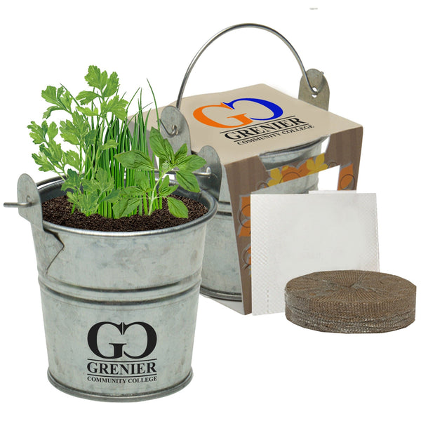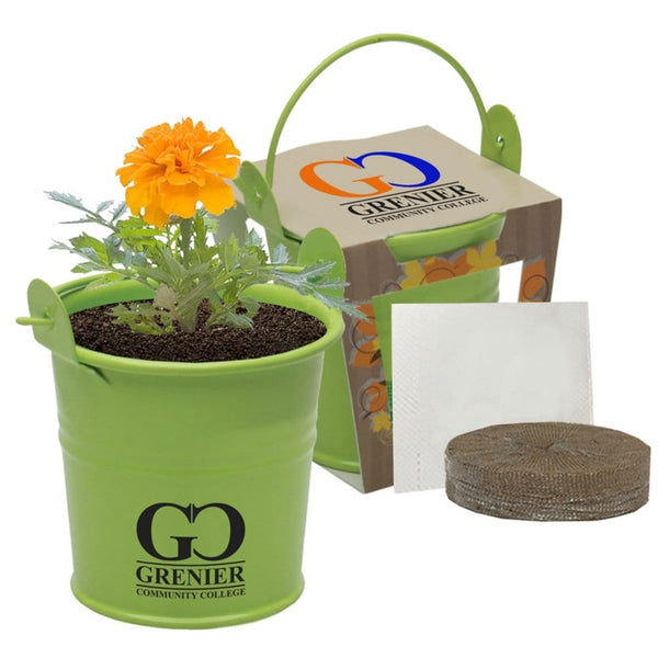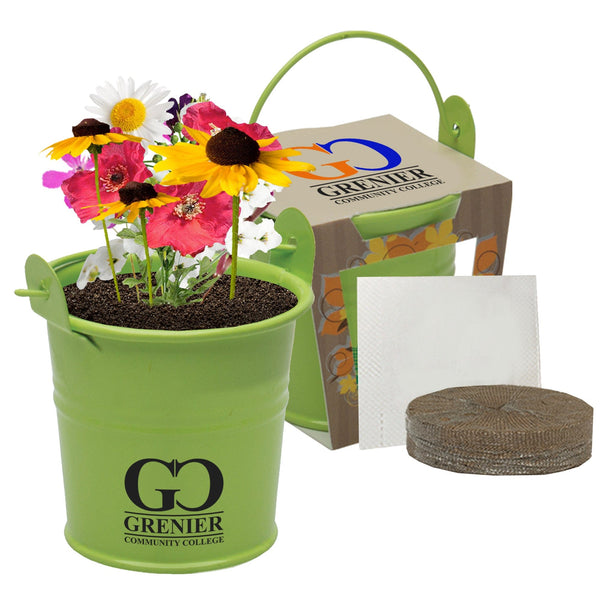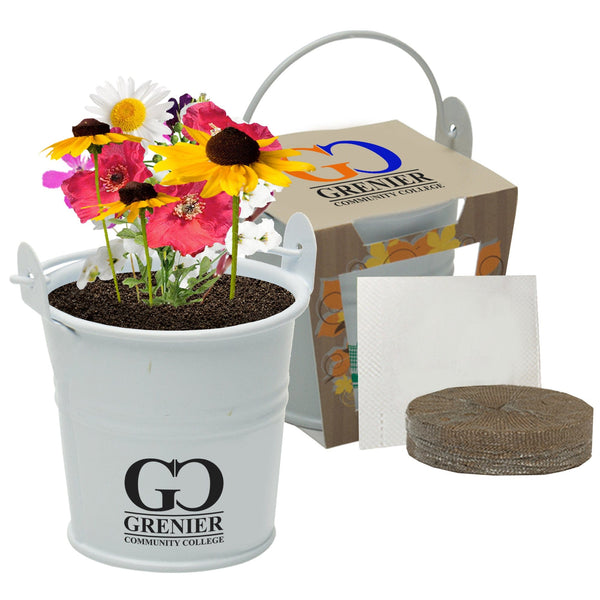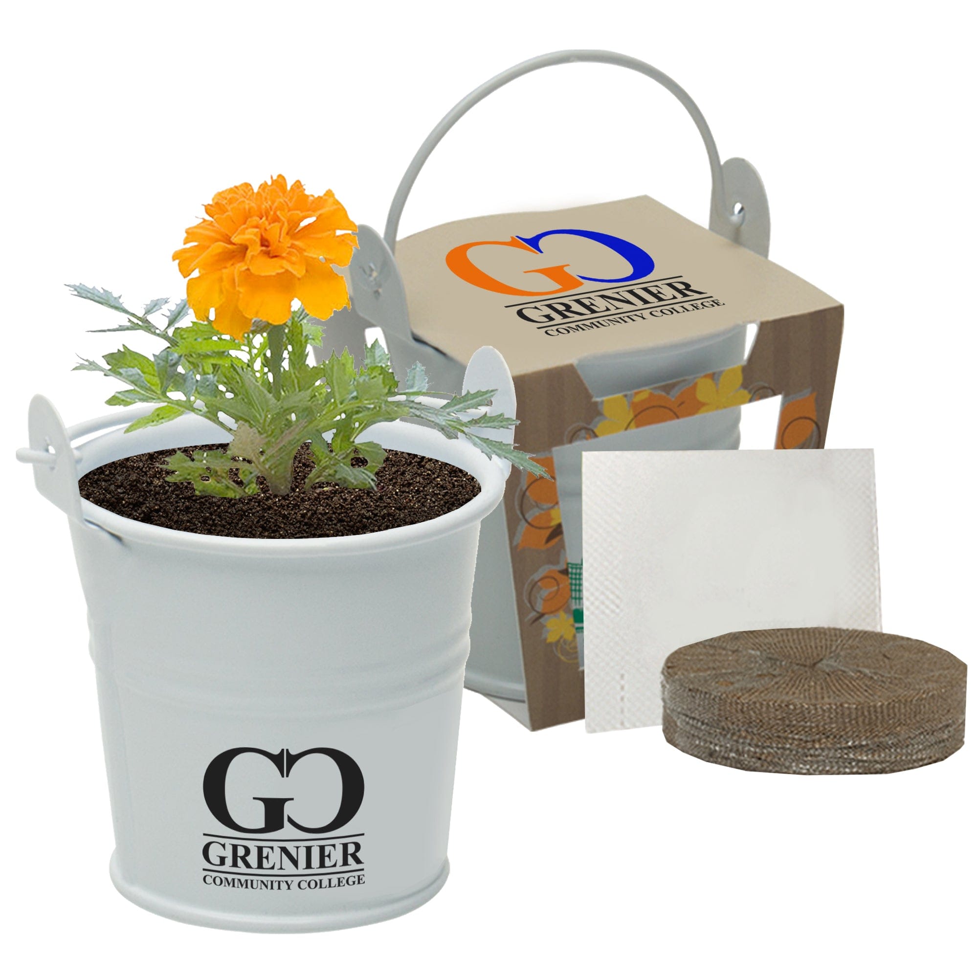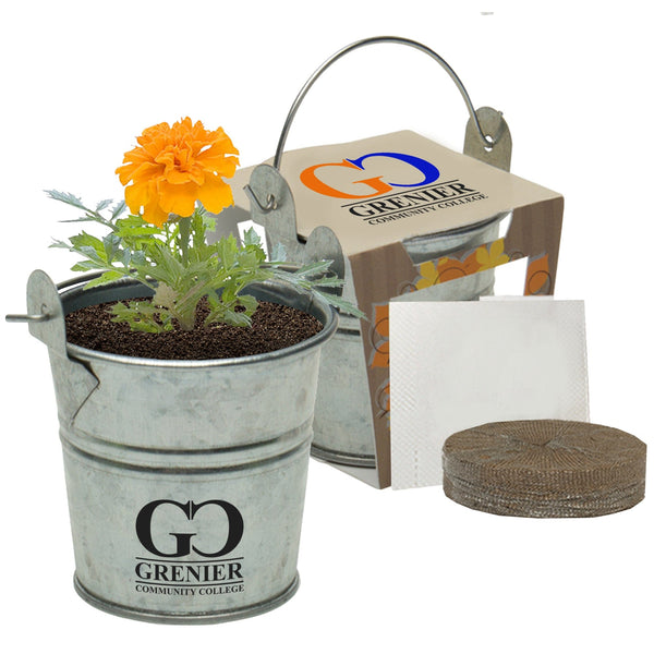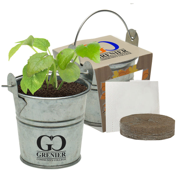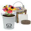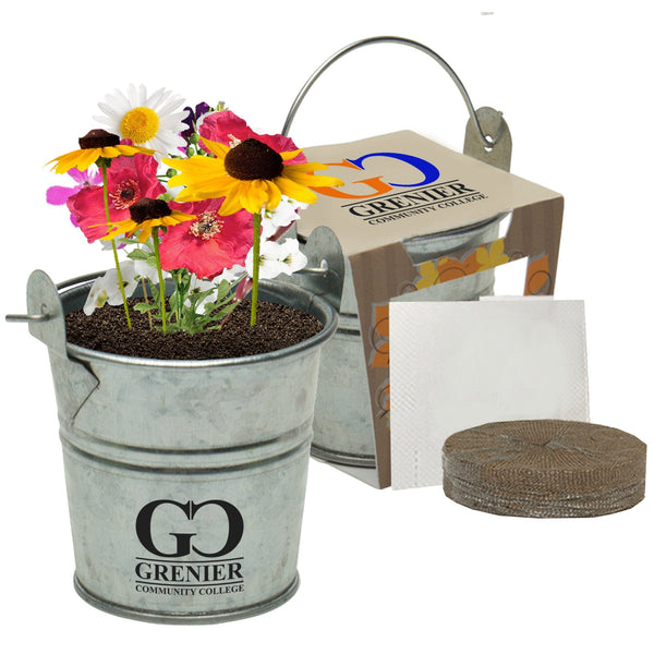 Deliver a fresh impression with a charmingly festive mini pail blossom kit. Made from galvanized metal, they are rust-resistant and designed to retain their color and finish. Each kit comes with a mini can planter, seed packet, peat pellet, as well as planting instructions.