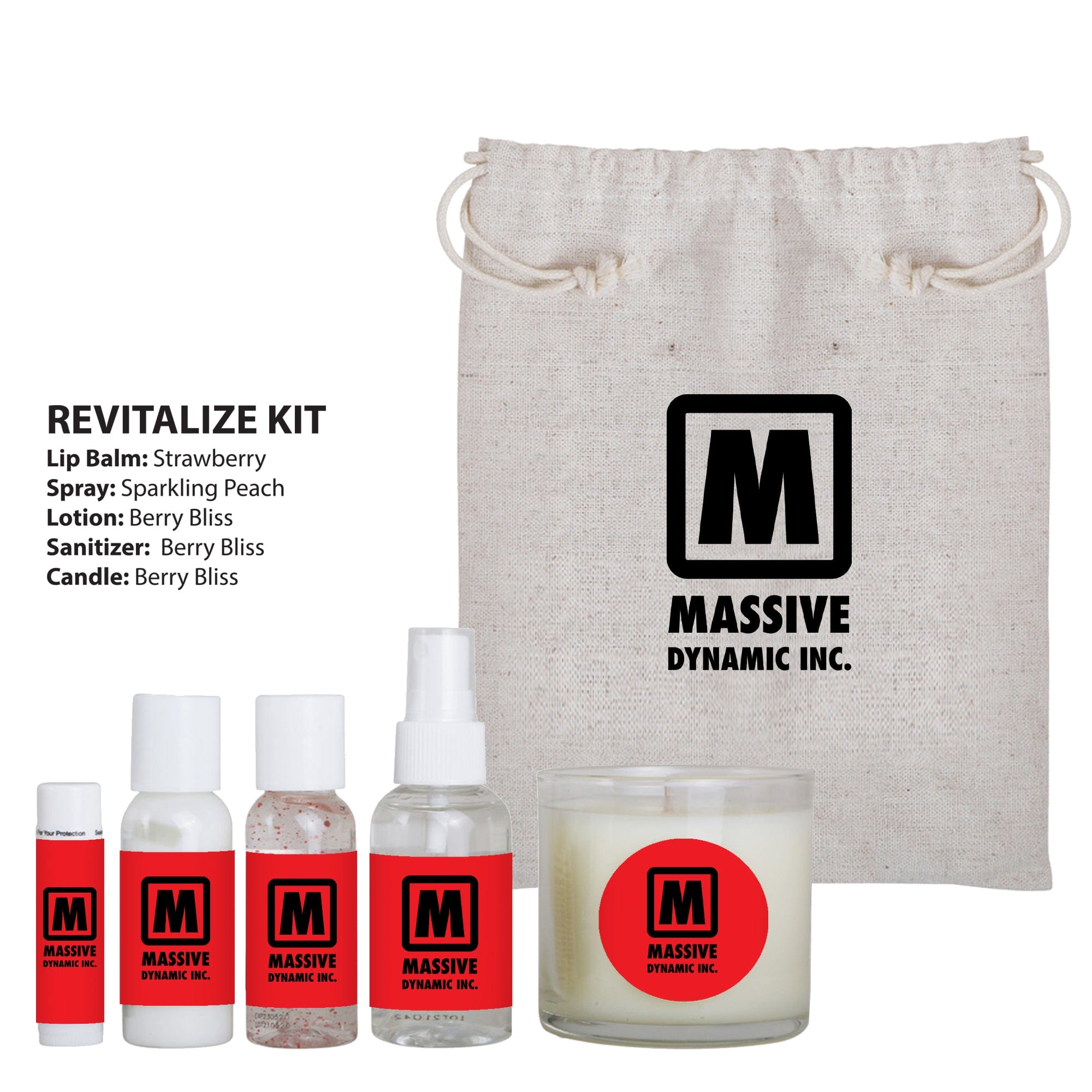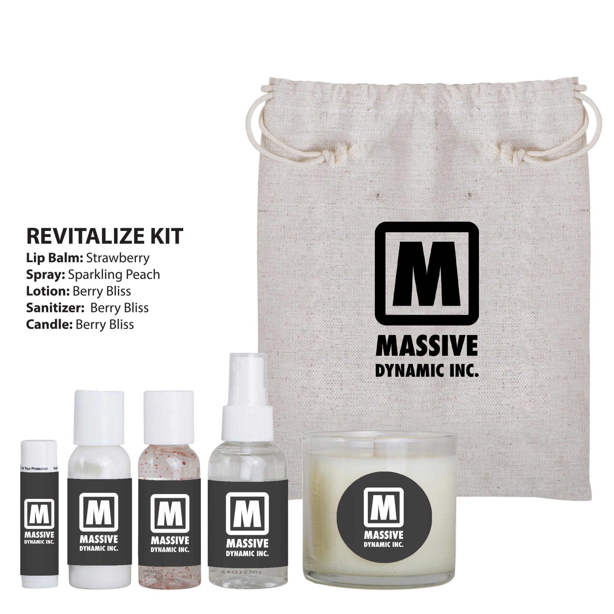 - REVITALIZE KIT includes: Strawberry Flavored Lip Balm, Sparkling Peach Scented Spray, and Berry Bliss Scented Lotion, Sanitizer, and Candle