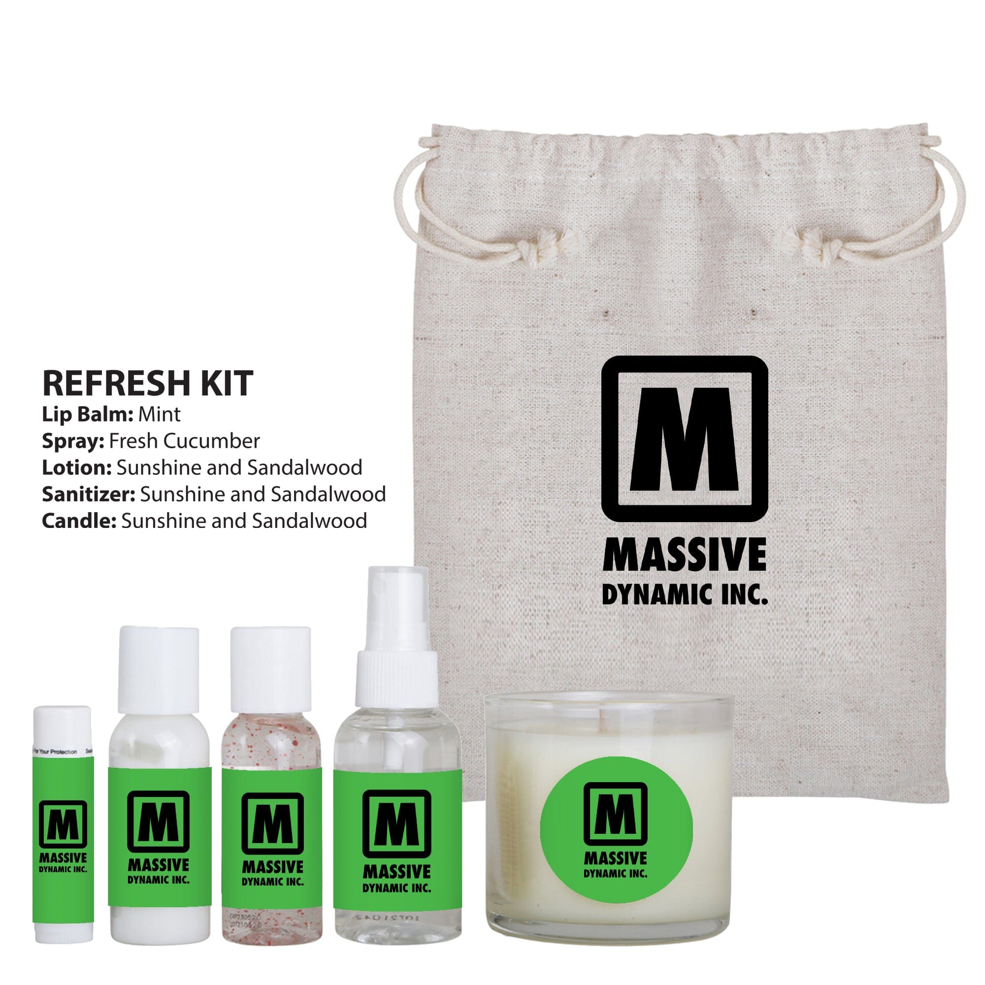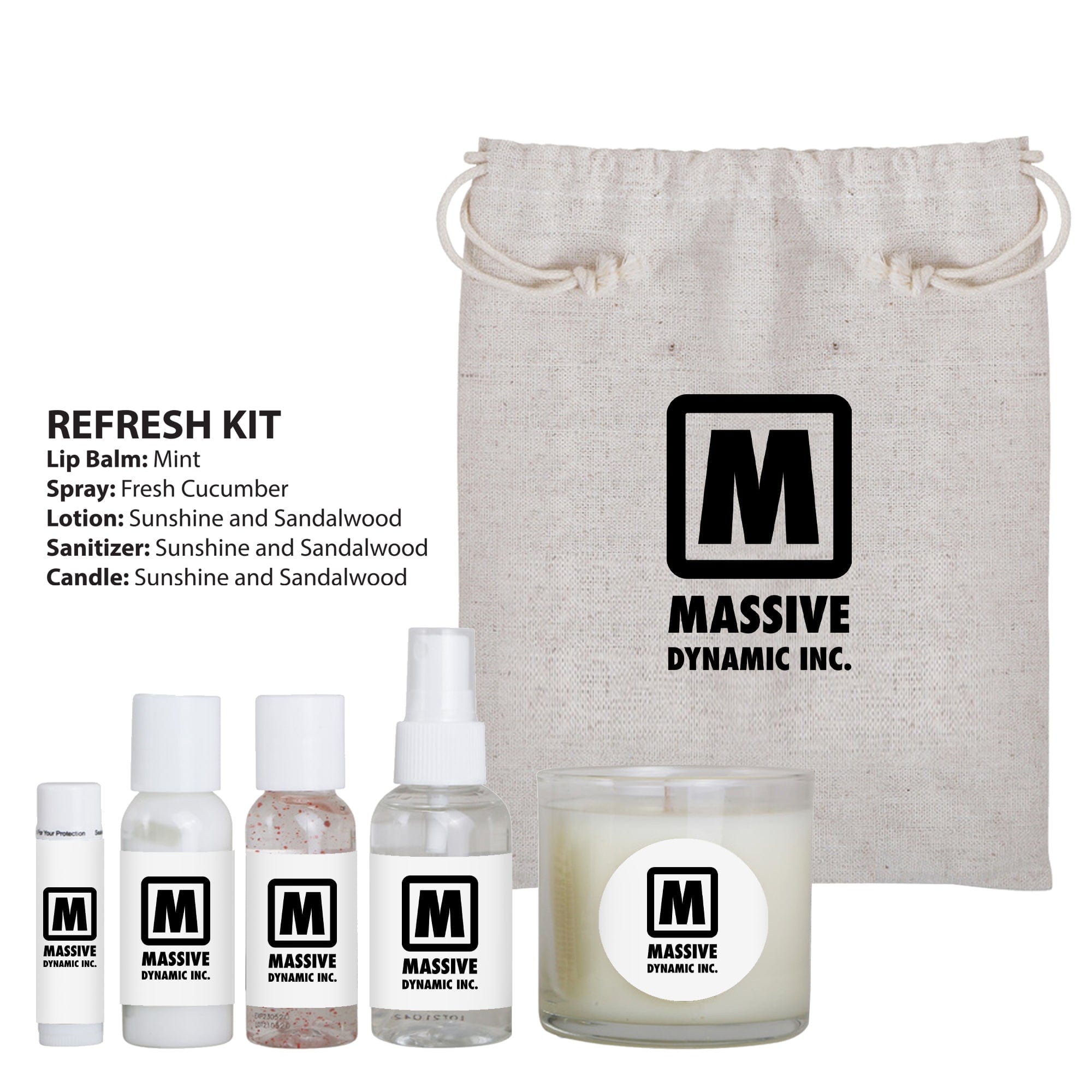 - REFRESH KIT includes: Mint Flavored Lip Balm, Fresh Cucumber Scented Spray, and Sunshine and Sandalwood Scented Lotion, Sanitizer, and Candle