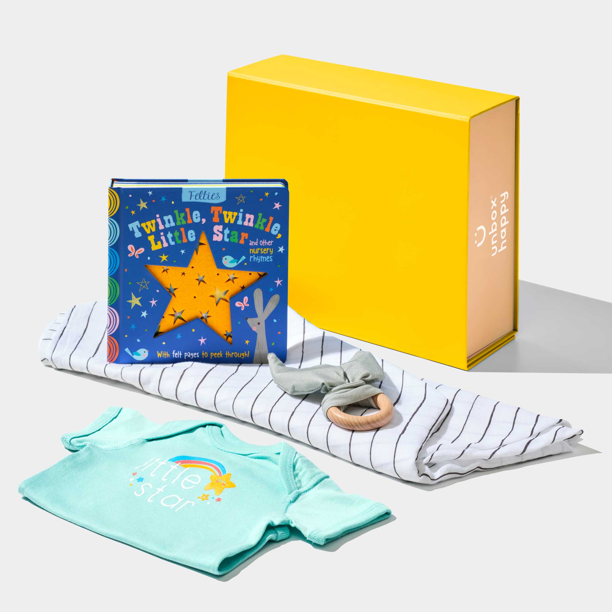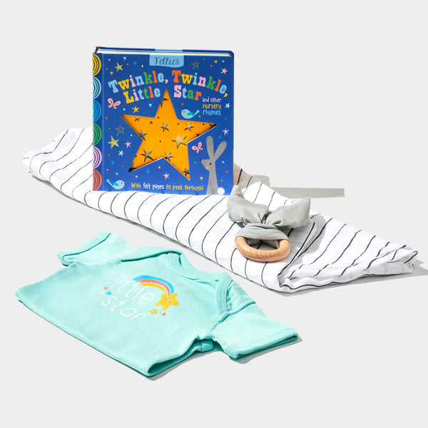 Includes: baby book | cotton sensory crinkle teether | muslin swaddle | 6-month baby onesie