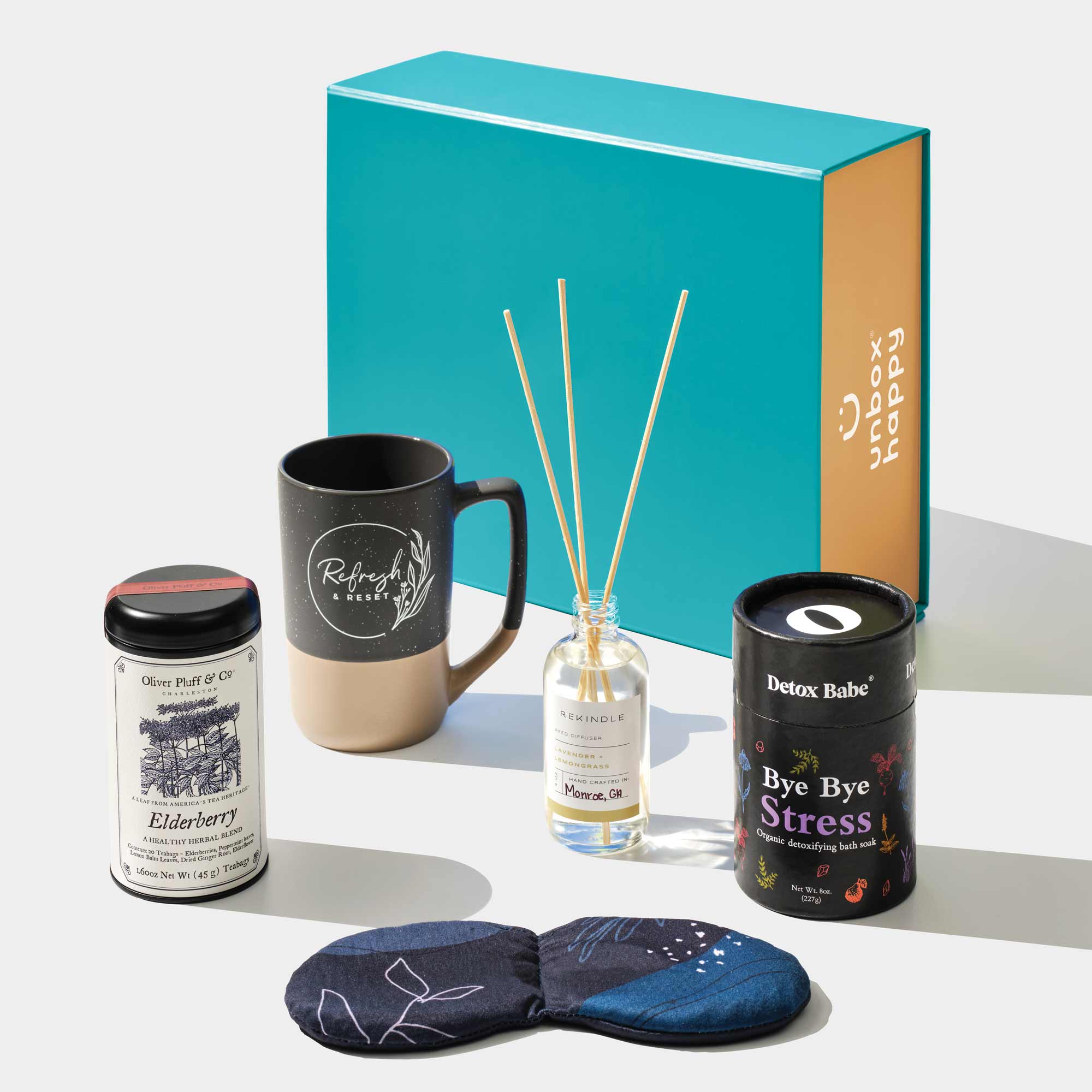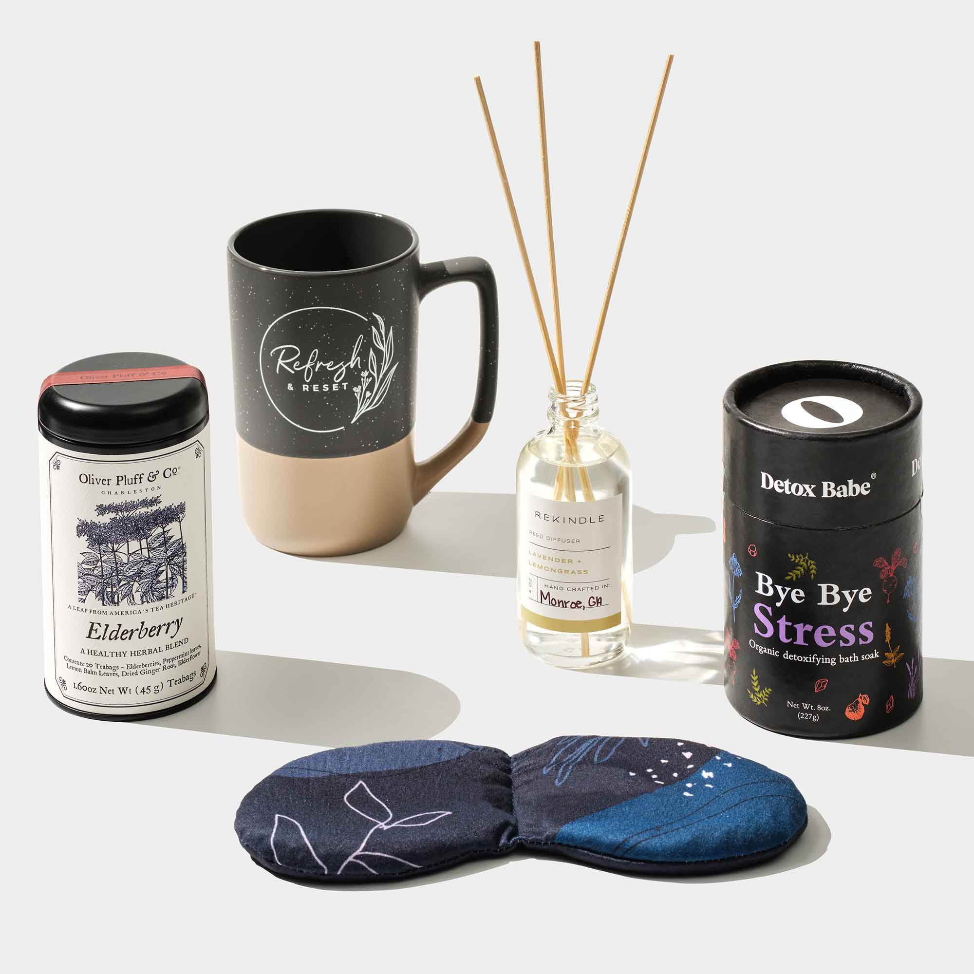 Includes: Stone mug | Eye mask | Bath soak | Elderberry tea | Reed diffuser