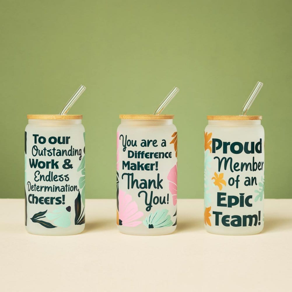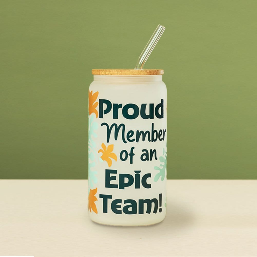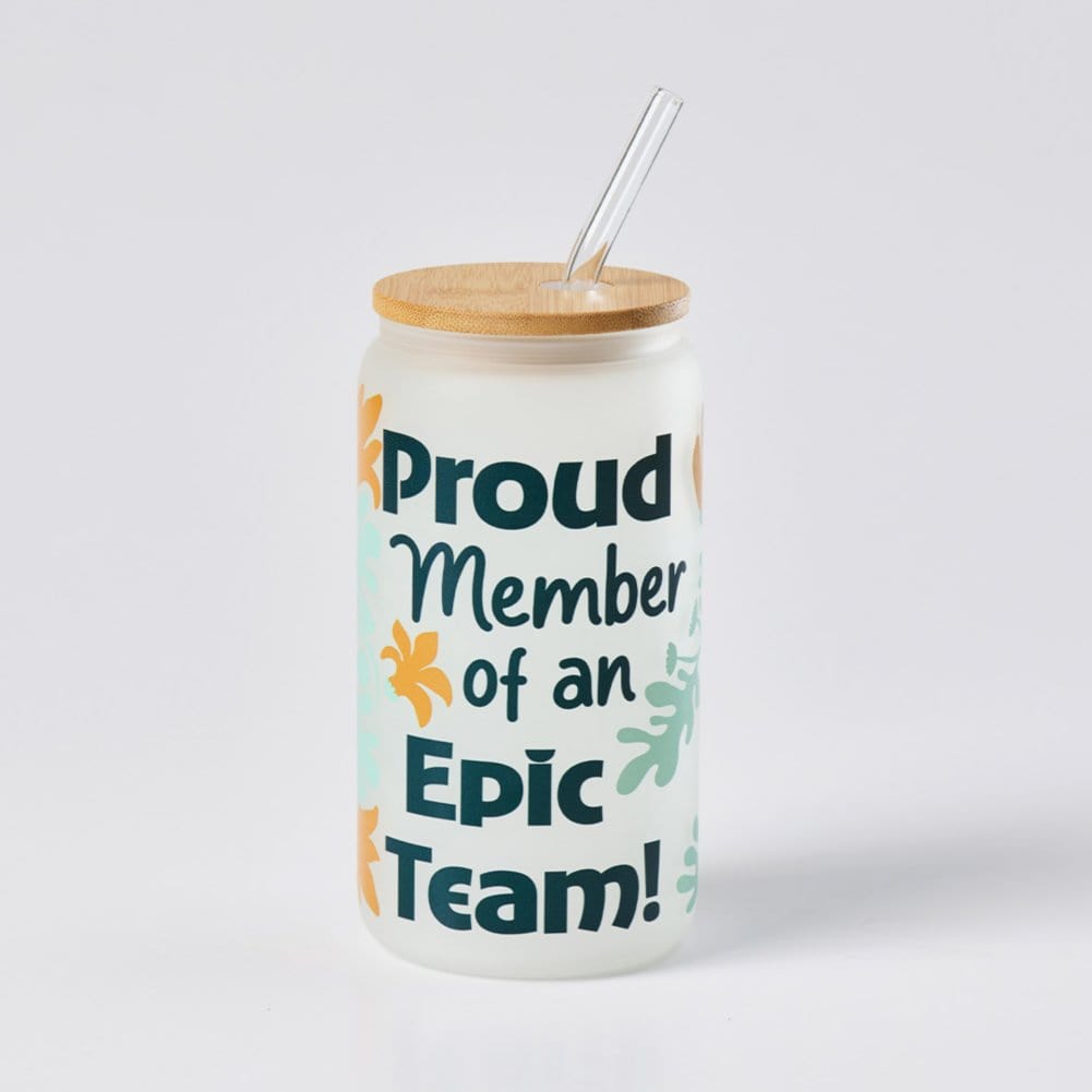 Elevate your team’s drinkware game with the Retro Recognition Frosted Glass Tumbler - Epic Team! This ultra-trendy can-shaped tumbler, complete with a bamboo lid and glass straw, is perfect for taking iced coffee or any cold beverage on the go. The sleek frosted glass finish and vibrant, full-wrap design make this tumbler a true standout. Featuring the words "Proud member of an epic team!", this Baudville Exclusive tumbler is a stylish way to show appreciation and gratitude to your team.