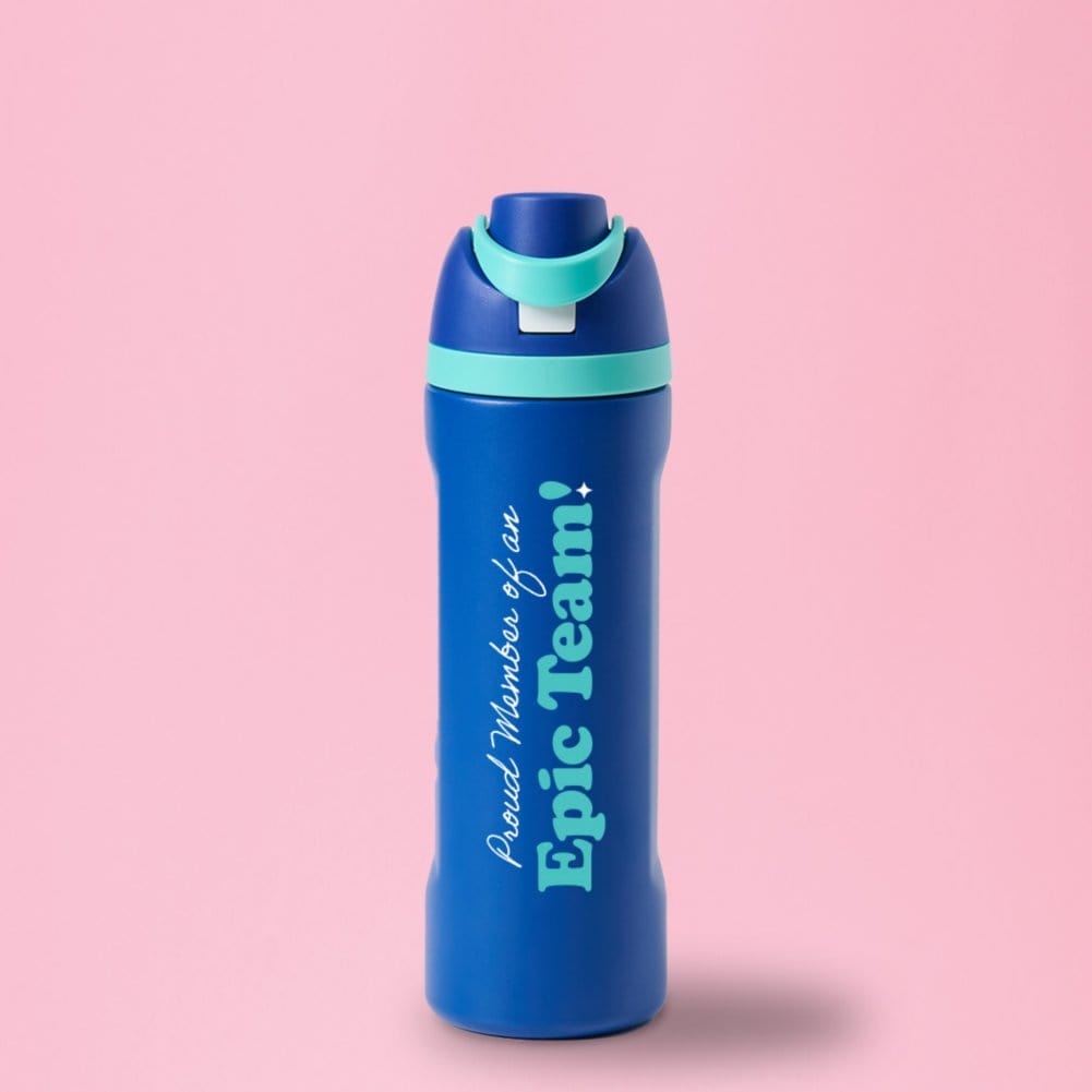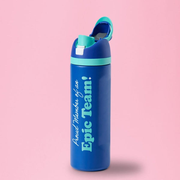 Love the look of brand-name bottles but not the price? The Stella Flip & Sip 24 oz Stainless Water Bottle has you covered! With a sleek and vibrant design in bright blue hues, this Baudville Exclusive bottle is more than just eye-catching—it's practical, durable, and fun. Featuring the inspiring message "Proud member of an epic team!" this water bottle is the perfect way to show appreciation and gratitude to your employees, team members, and volunteers.