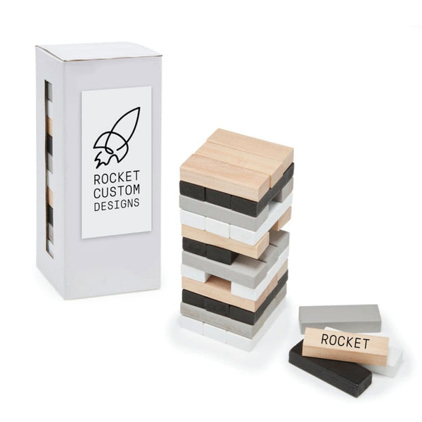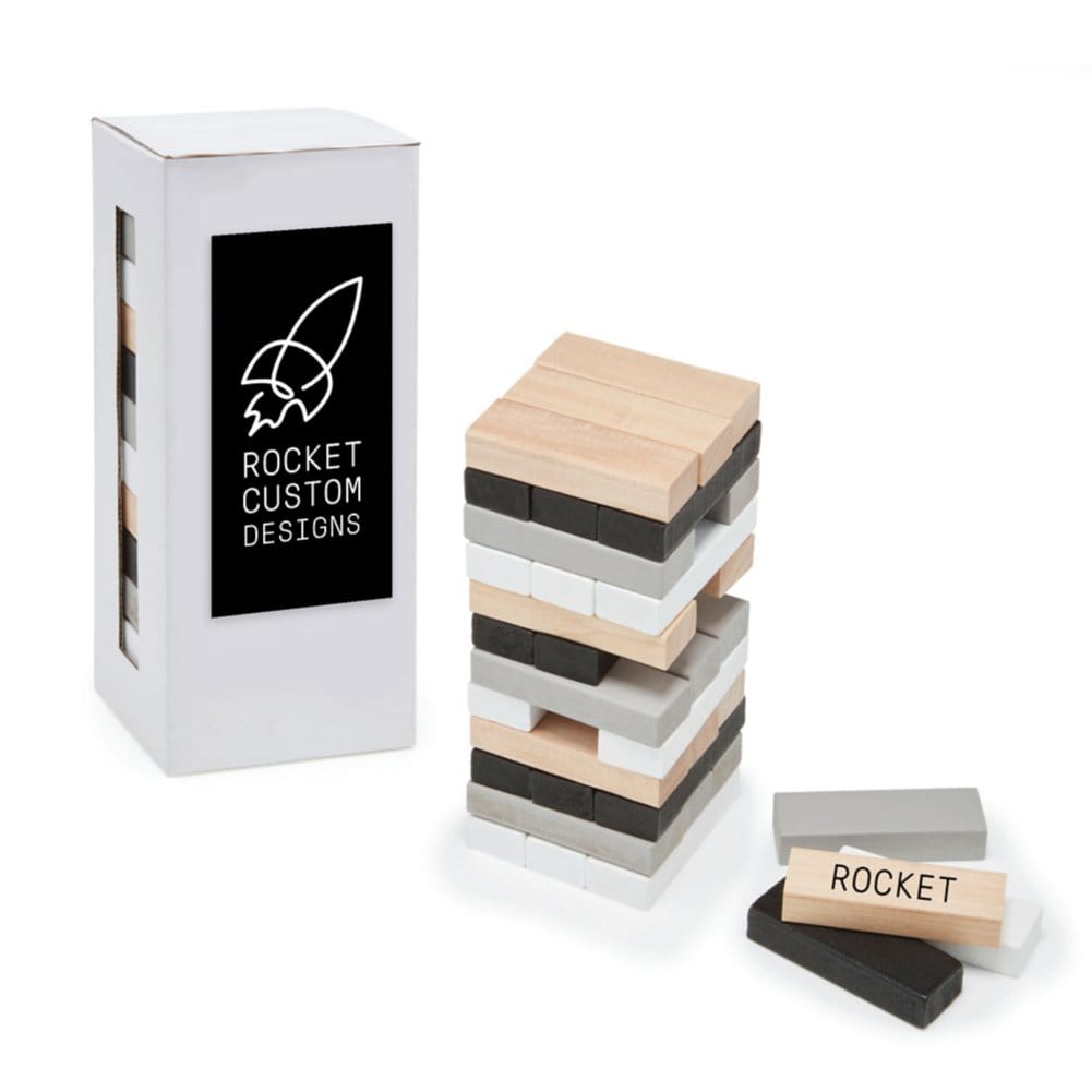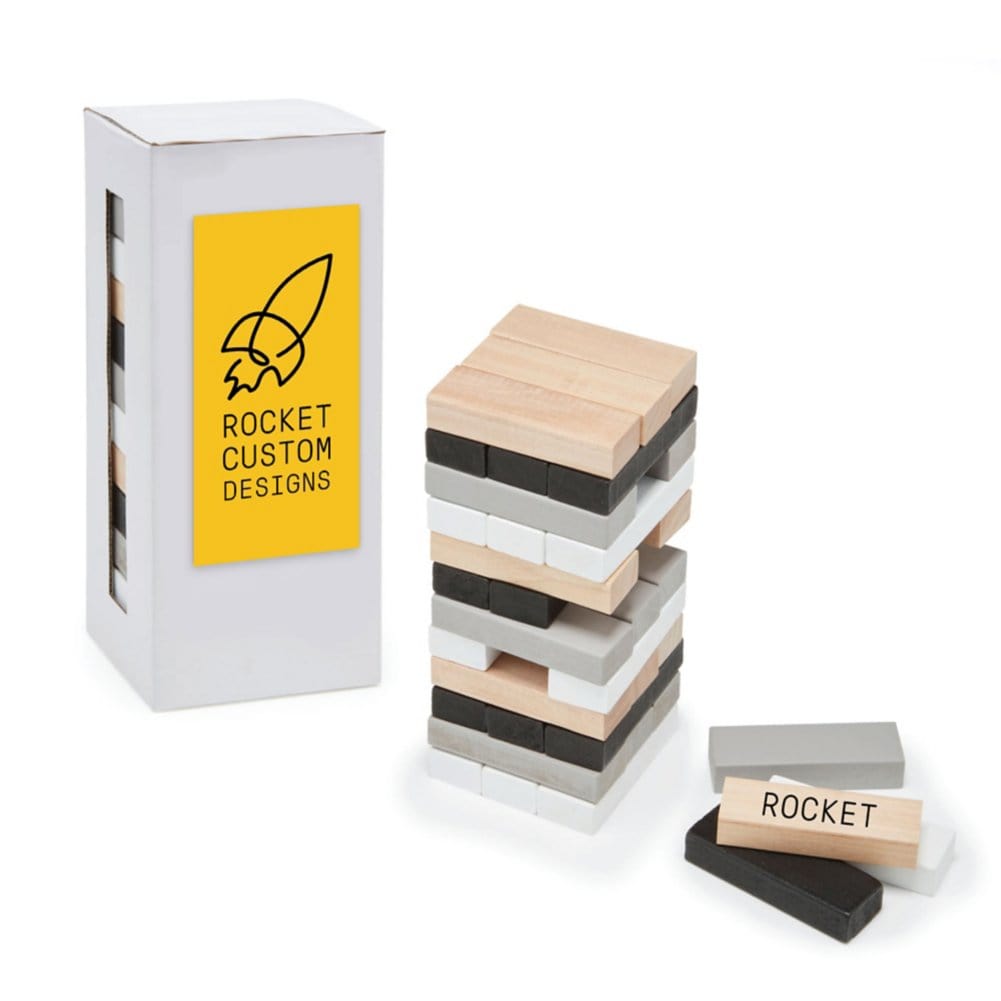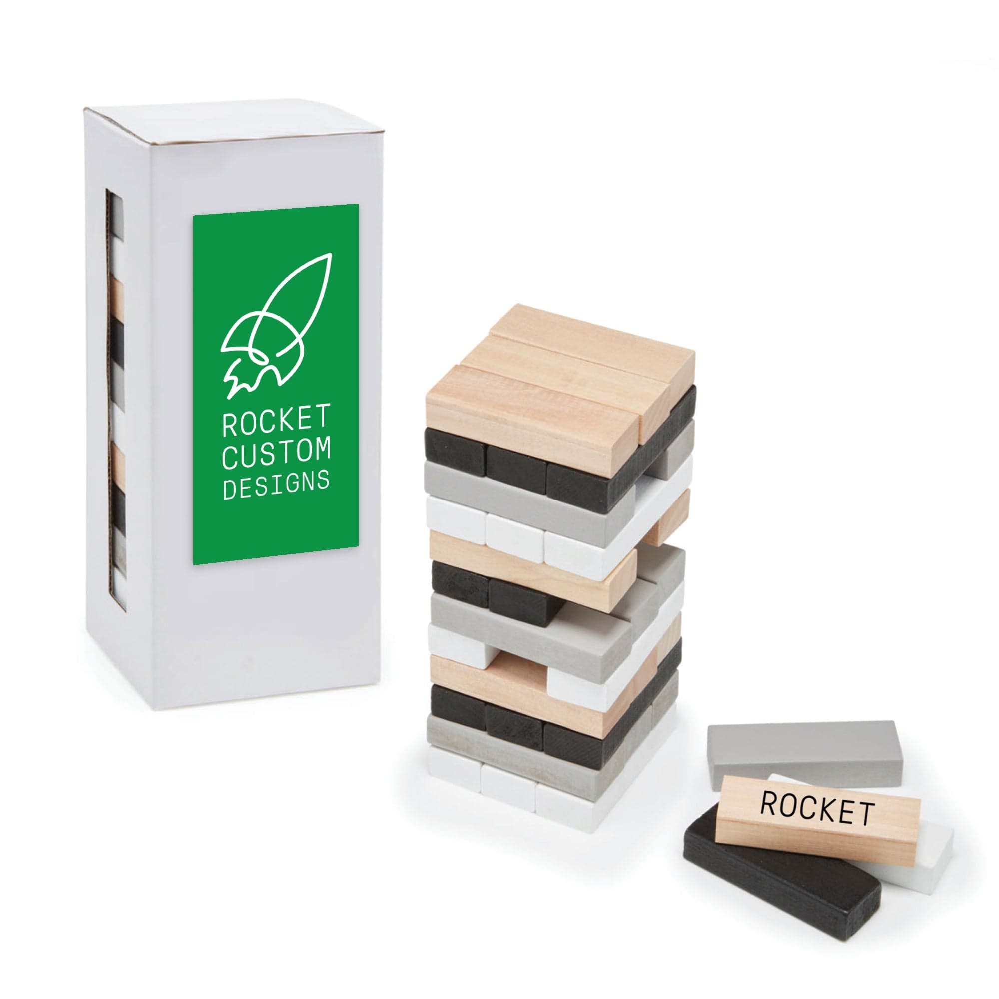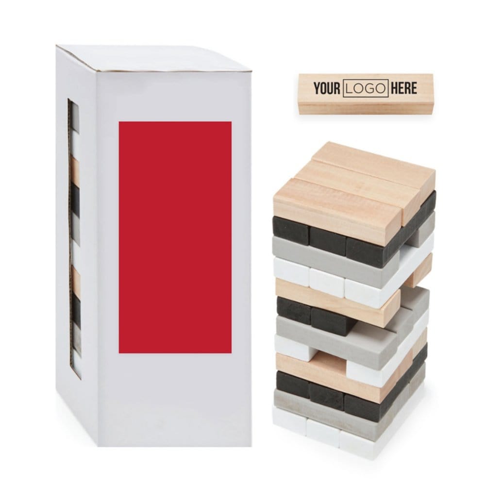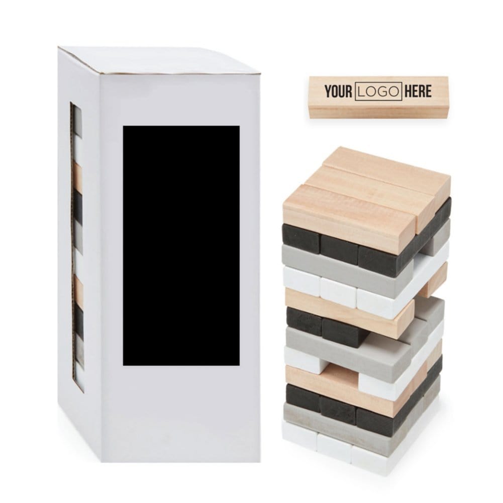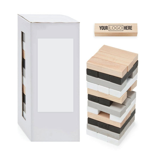 Elevate your next gathering with the Game Night Towering Blocks, the ultimate indoor or outdoor activity that brings everyone together for endless fun. This classic game is all about stacking the wooden blocks higher and higher, testing your skill and luck until the tower inevitably comes crashing down. With your logo prominently displayed on the package and one of the blocks, this game transforms into a unique piece of branded swag that not only entertains but also enhances brand visibility.