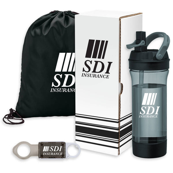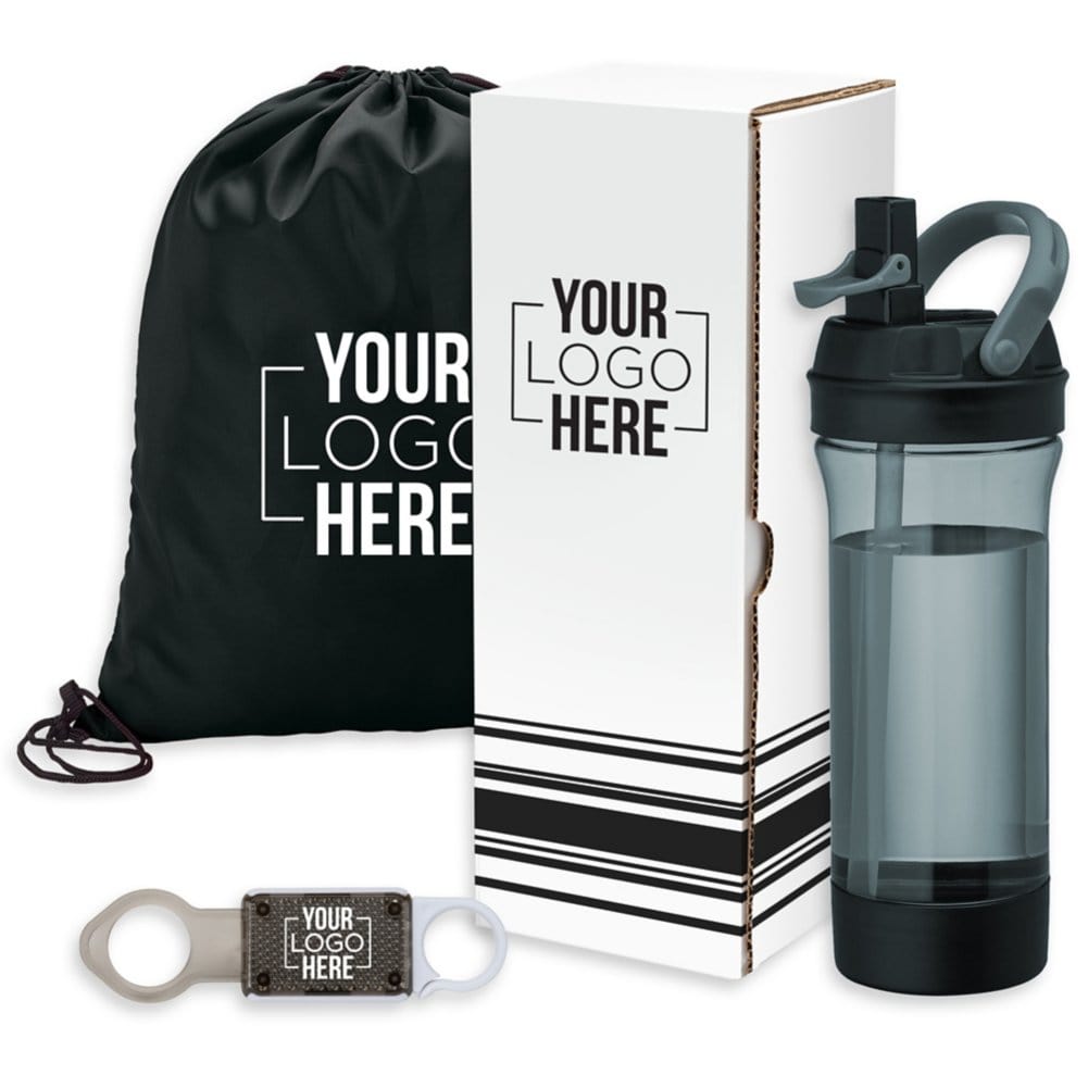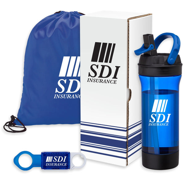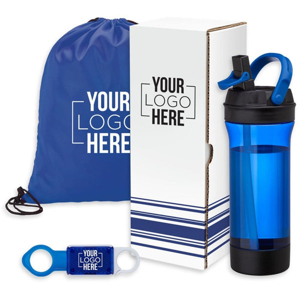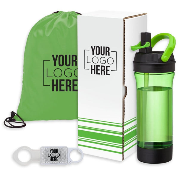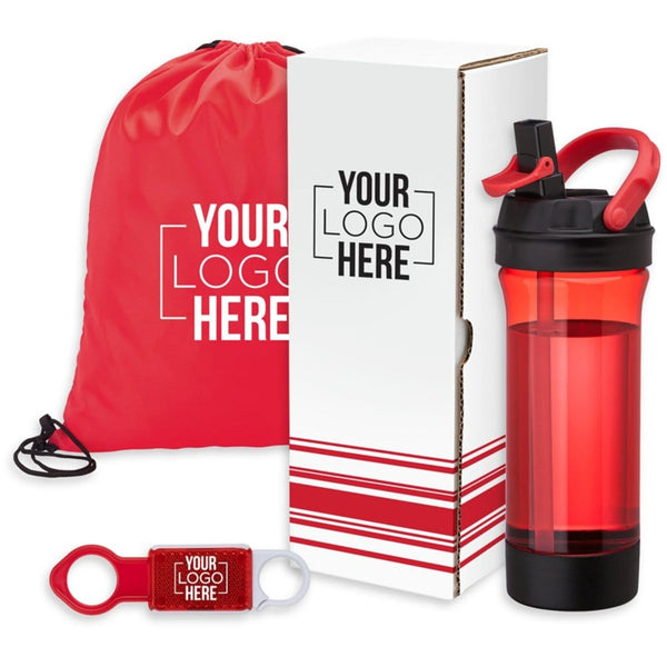 This gift set is perfect for your next wellness initative! Set includes a 25 oz. Tritan flip-spout bottle with integrated straw and carry handle, 4-in-1 multi-function bottle holder with a reflective flashing light and a sport bag with a drawstring closure. Grab the 3-Piece Fitness Gift Set for your business partners, associates and employees!