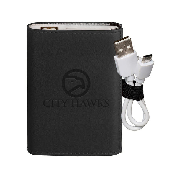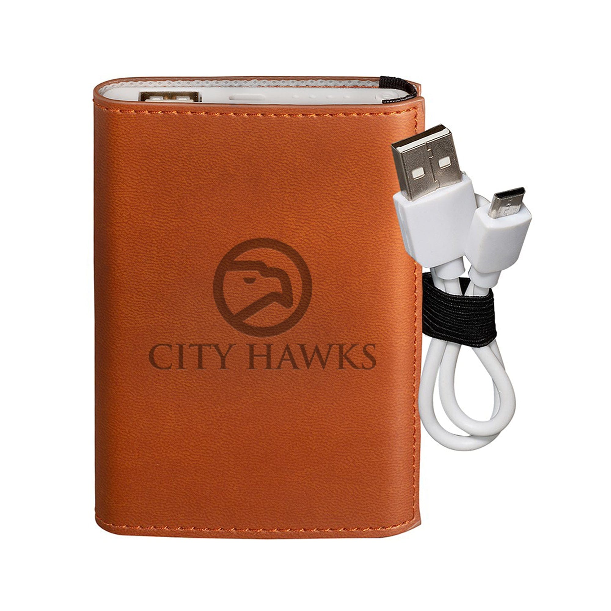 This slim aluminum power bank includes a soft PU leather-like accent wrap body.