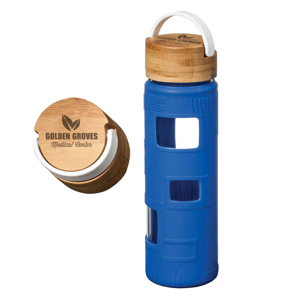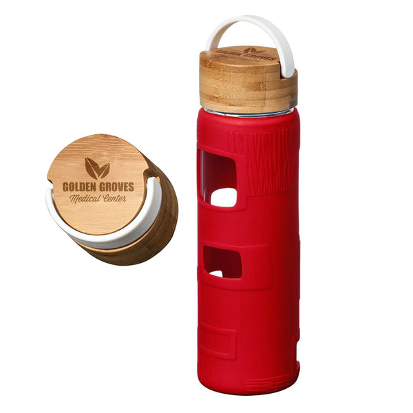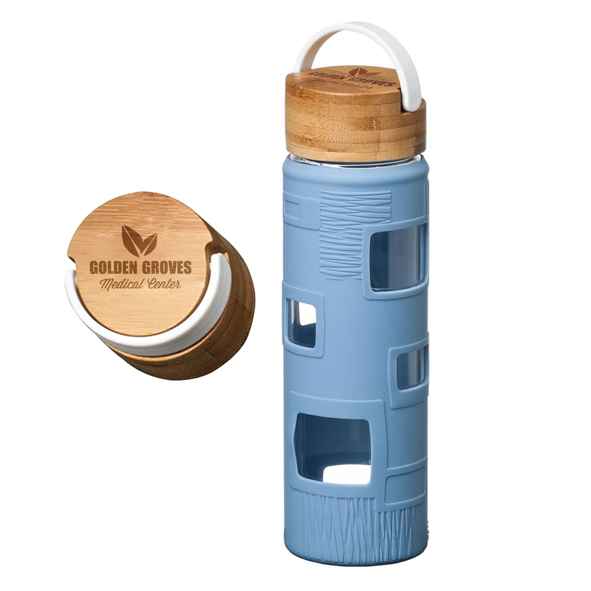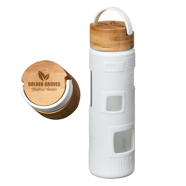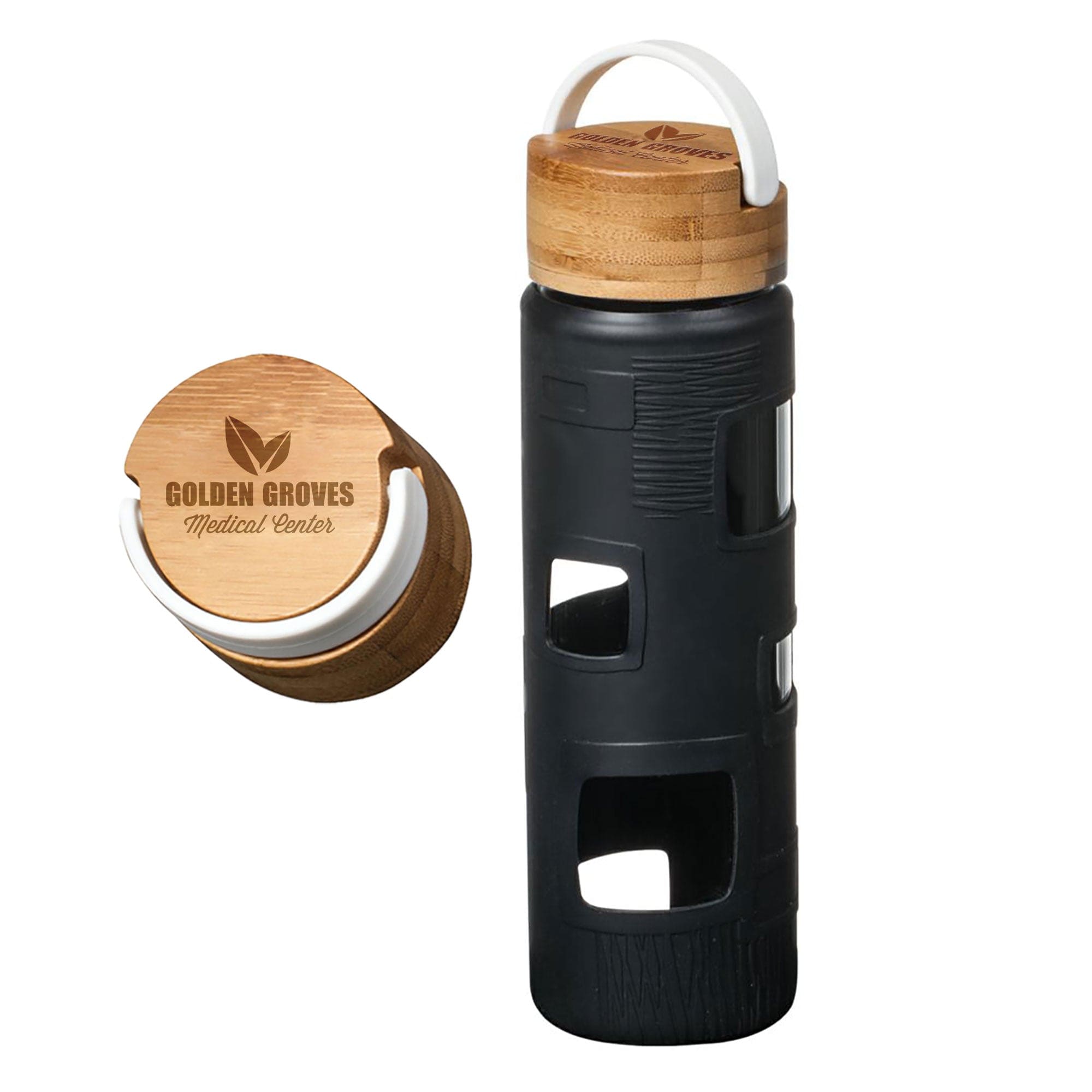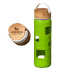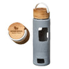 High quality Borosilicate glass water bottle with exceptional performance qualities. Modular window design, silicone sleeve with textured grip surface. Contoured, strong, durable, natural bamboo screw top cap. Sturdy PP flip carry handle with integrated tuck-away groove recess. The perfect combination of ultimate performance and leading edge design