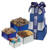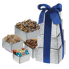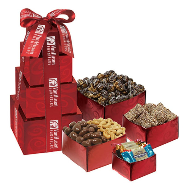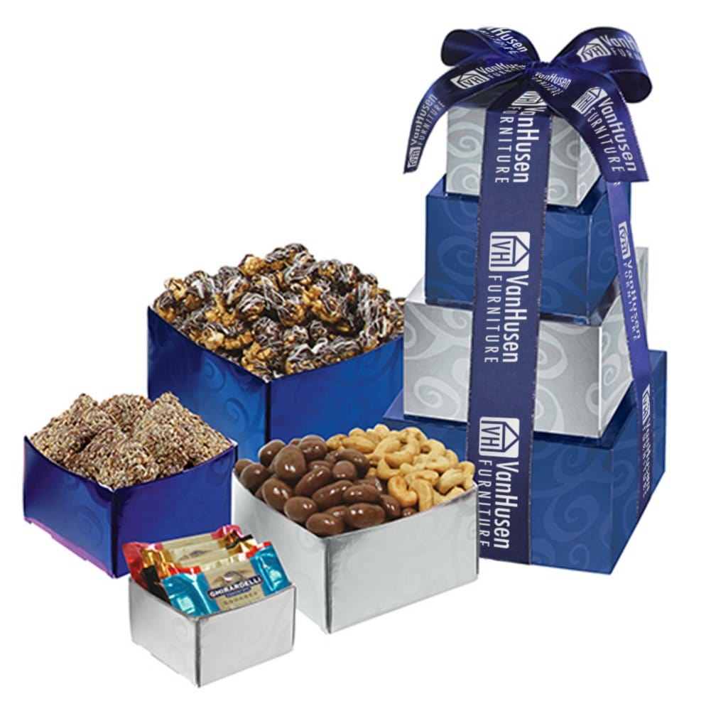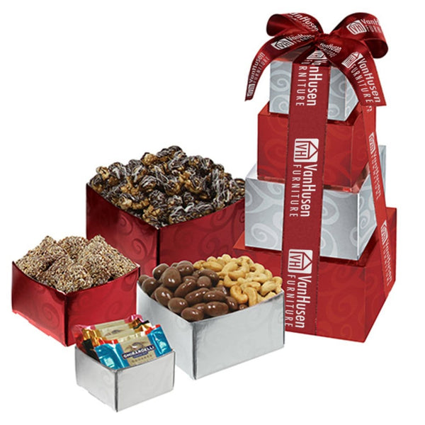 Delight your clients, employees, and business partners with the irresistible treat tower. Includes: White & Dark Chocolate Swirl Popcorn, Chocolate Covered Almonds, Cashews, English Butter...