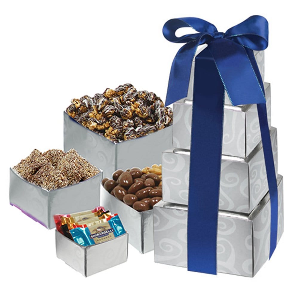Delight your clients, employees, and business partners with the irresistible treat tower. Includes: White & Dark Chocolate Swirl Popcorn, Chocolate Covered Almonds, Cashews, English Butter Toffee and Assorted Ghirardelli® Squares (2 lbs 5.9 oz)