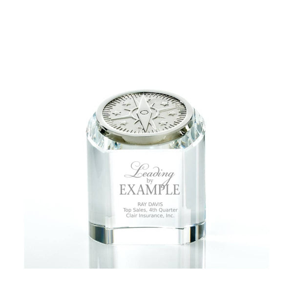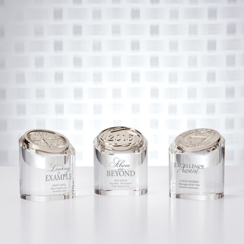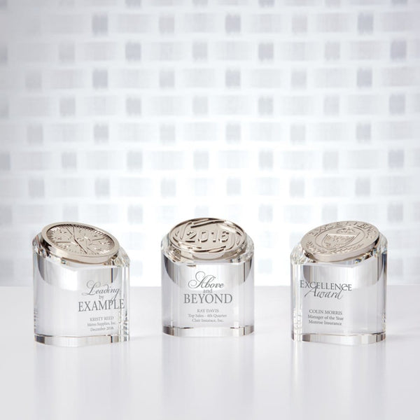 A brilliant silver themed medallion tops each of these beautiful crystal pillars. Engrave your choice of graphic titles and three lines of personalization on the... Read More