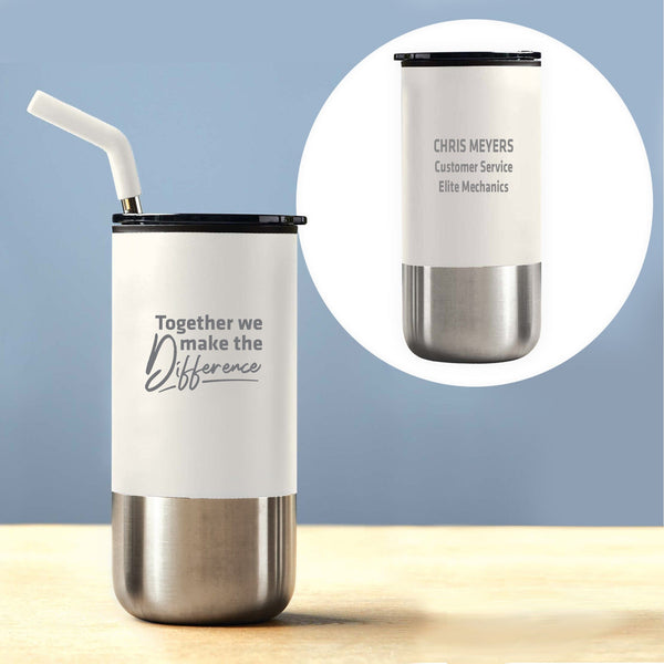 Drink your favorites hot or cold! Double-wall construction featuring sleek two tone design includes a straw and a press-on lid with slide-closure for easy use.