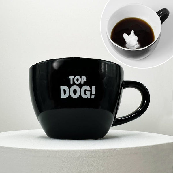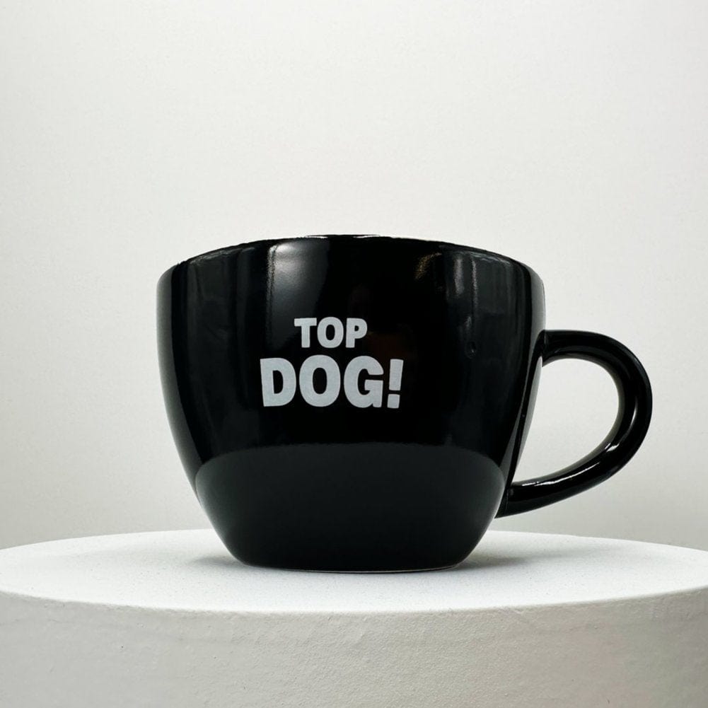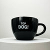 - Sleek black ceramic mug with bold “Top Dog!” sentiment
