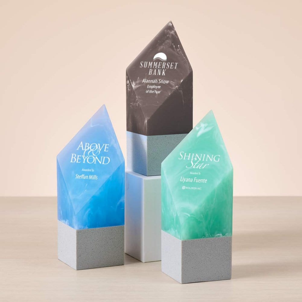 Recognize greatness with the Pillar of Excellence Trophy Collection: Blue, a Baudville Exclusive award that merges classic recognition with a contemporary, artistic touch. This mixed-media trophy features a sturdy cement base paired with a stunning swirled blue resin peak, creating a captivating look that doubles as a work of art. It’s a refined balance of fun and sophistication, making it the perfect choice for honoring top performers.