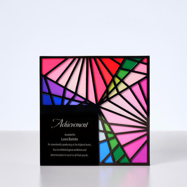 Celebrate achievements in style with the Radiant Recognition Trophy - Square, a truly one-of-a-kind award that elevates recognition to an art form. Inspired by the beauty of stained glass, this trophy combines metal and acrylic to create a vibrant display of colors, featuring stunning shades of pinks, reds, blues, and greens in a mesmerizing pattern. Its elegant and artistic design makes it an eye-catching piece for both office and home display, leaving a lasting impression on anyone who sees it.