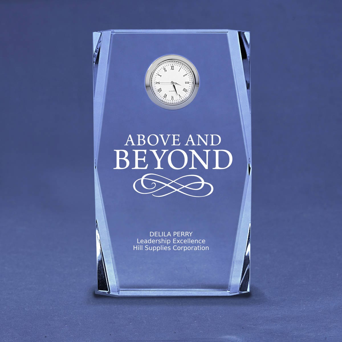 This weighty crystal trophy features stylish beveling and a sharp silver timepiece accent. Includes a graphic title and up to four lines of personalization. Comes in a black gift box.