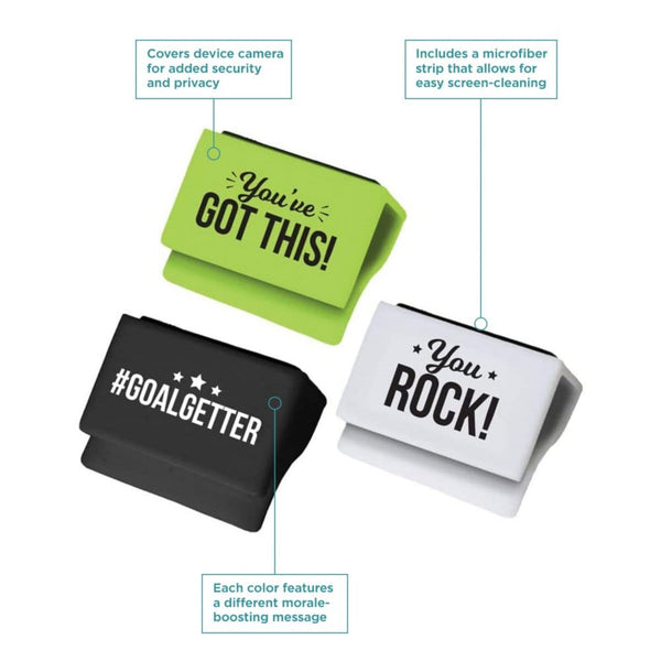 - 3 plastic clips; 1 green, 1 black, 1 white and fits laptops, tablets, or smartphones