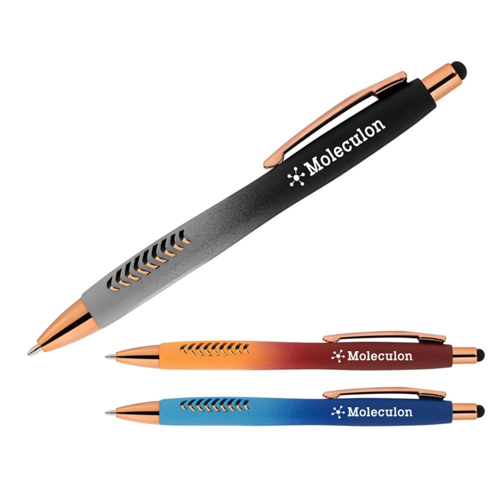 Enhance your professional image with the Avalon Ombre Softy Rose Gold Pen with Stylus. Order now to elevate your brand presence and provide recipients with a functional yet stylish tool they'll cherish.