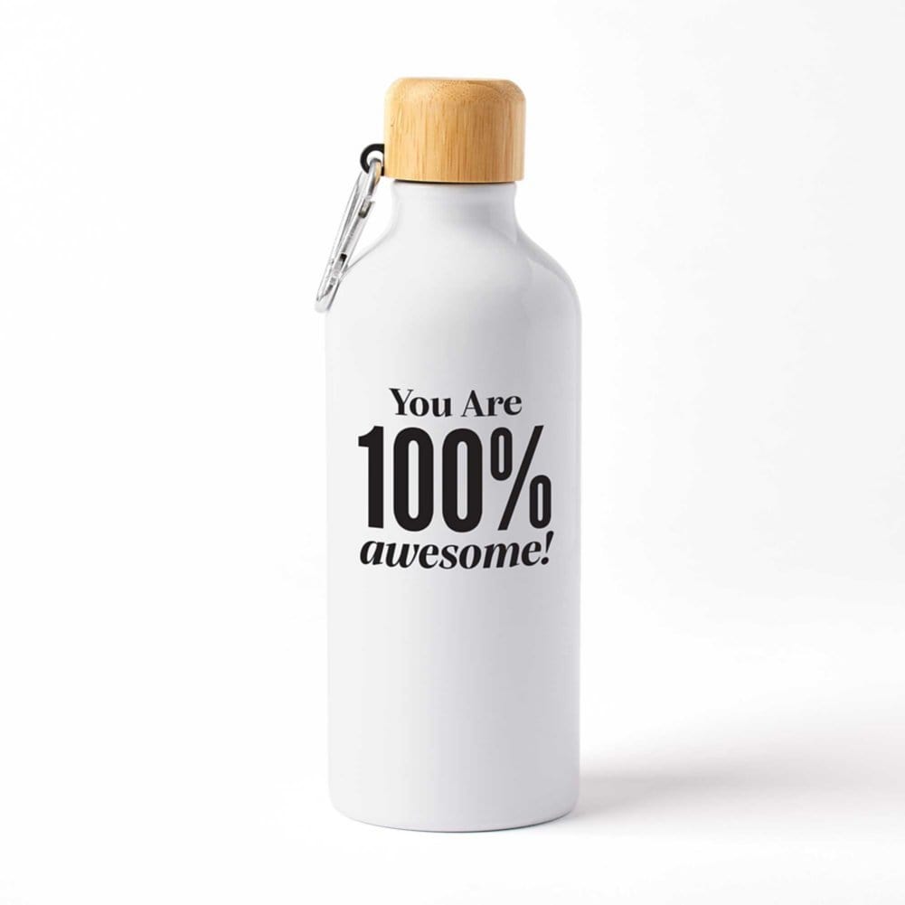 Introducing the 20oz Adventure Water Bottle: your passport to style, vibrancy, and functionality all in one sleek, polished package. Crafted from durable aluminum, this pristine white bottle, imprinted with the inspiring message "You are 100% Awesome," stands out with its captivating combination of a vibrant, eye-catching exterior and a secure screw-on, spill-resistant bamboo lid featuring a convenient metal carabiner.