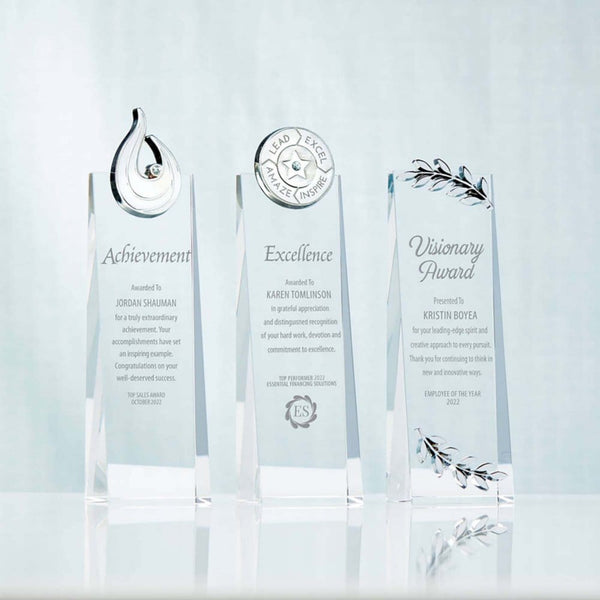 Engraved from the back, our pre-written verses make the Crystalline Tower Trophy stylish pieces simple to order and unbelievable to receive. Choose from a variety of pre-written award verses and add up to three lines of personalization for a special award trophy. Trophy arrives gift boxed and ready to give.