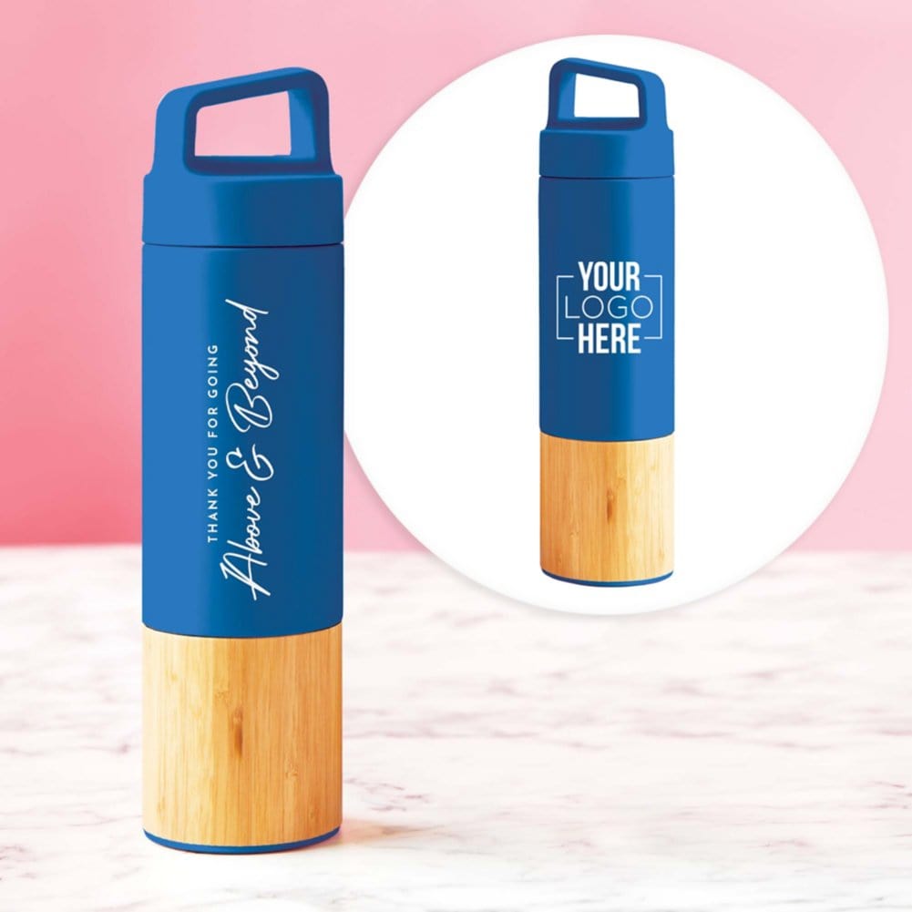 You will be the talk of the office when you give your team this super stylish color on top and bamboo on the bottom twist on water bottle. This sleek design allows for easy handling.