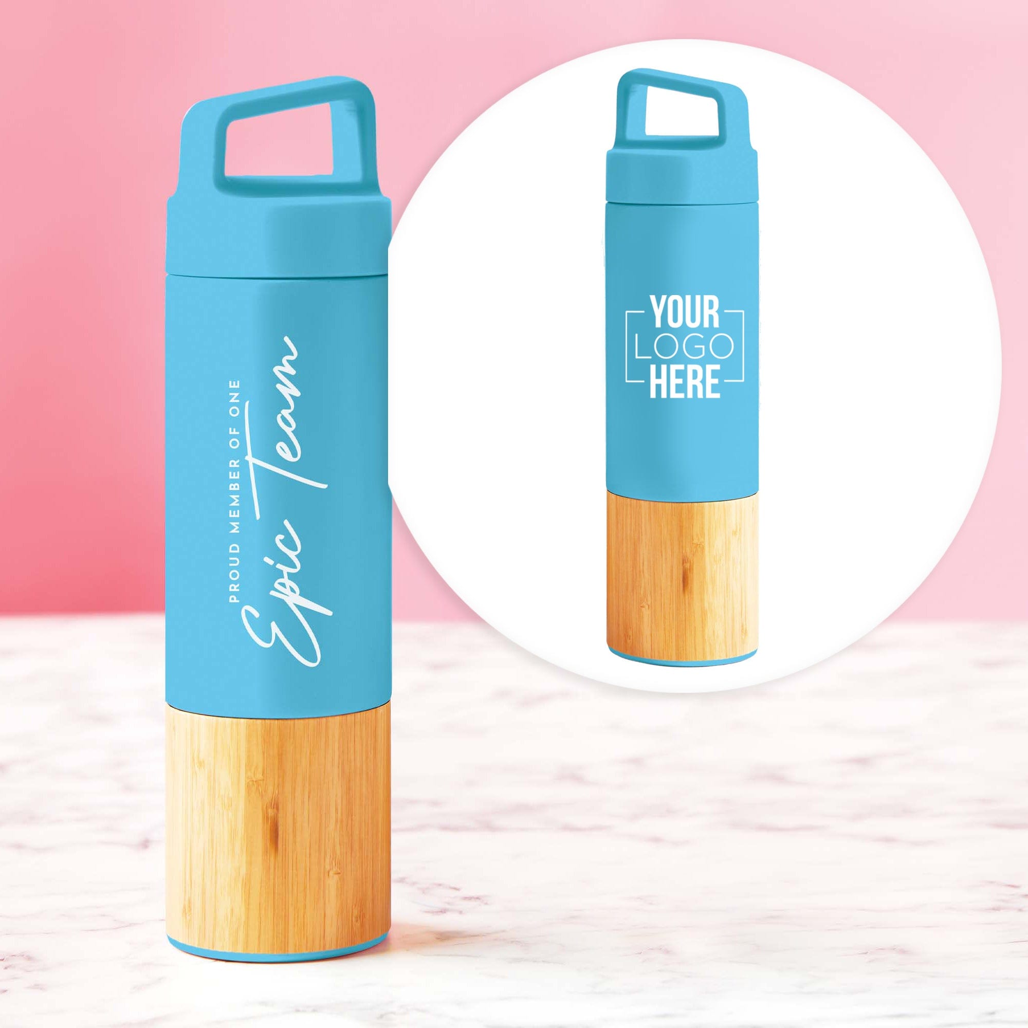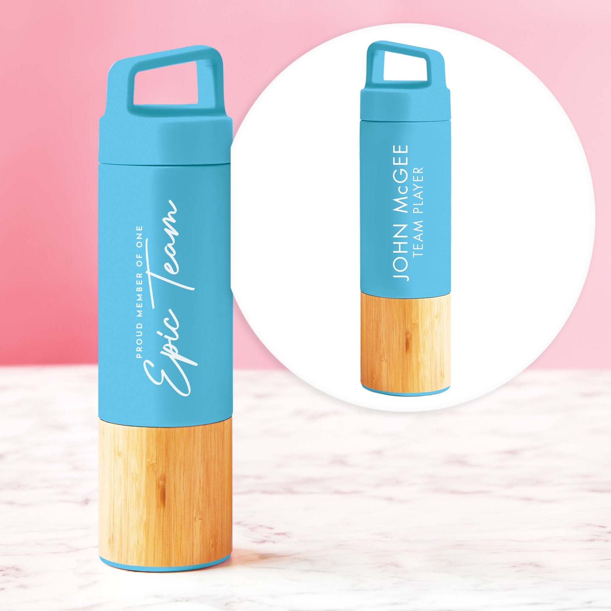 You will be the talk of the office when you give your team this super stylish color on top and bamboo on the bottom twist on water bottle. This sleek design allows for easy handling.