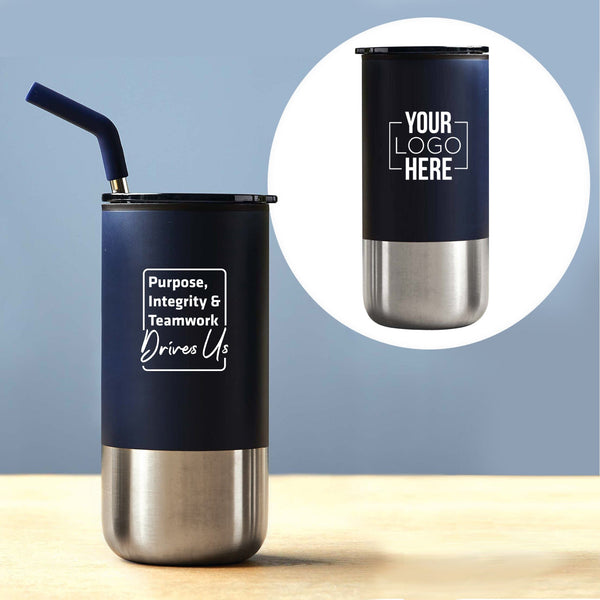 Drink your favorites hot or cold! Double-wall construction featuring sleek two tone design includes a straw and a press-on lid with slide-closure for easy use.