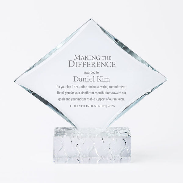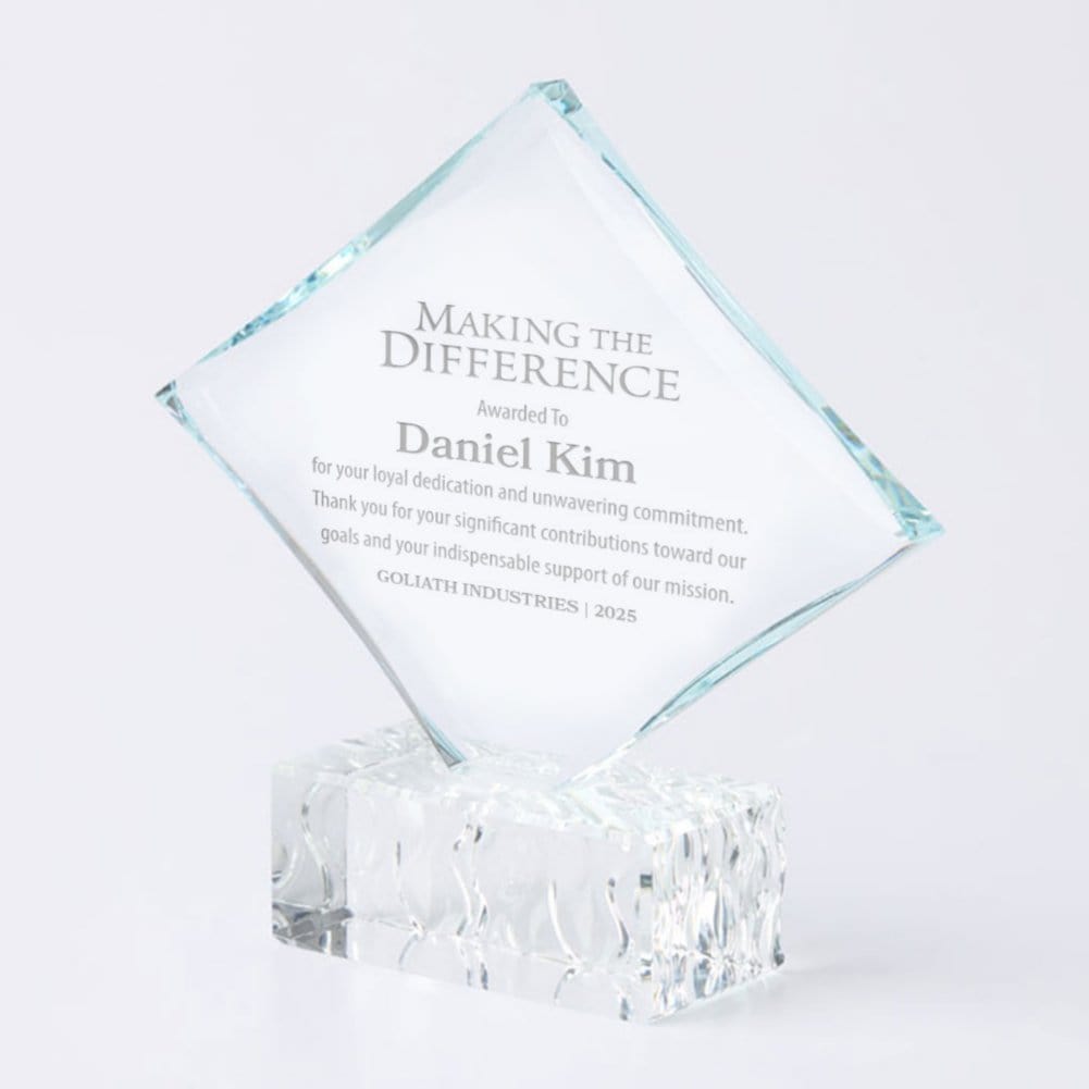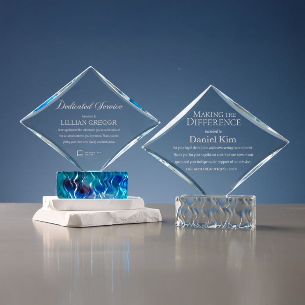 Crystal awards stand out for their brilliance and clarity and our Diamond Liuli Crystal Trophies are no different. Handcrafted, colored glass awards known for their vibrant hues & elegant translucency. These stunning awards offer an executive appearance that elevates any recognition occasion. Whether you’re hosting an end-of-year award ceremony or highlighting incredible achievements throughout the year, the Diamond Liuli Crystal Trophy is perfect for any corporate initiative. Personalize this award with a logo, name, and custom text to make it truly one of a kind. Delivered presentation-ready in a sleek display box, this trophy is perfect for momentous occasions, ensuring your recipients feel valued and celebrated.