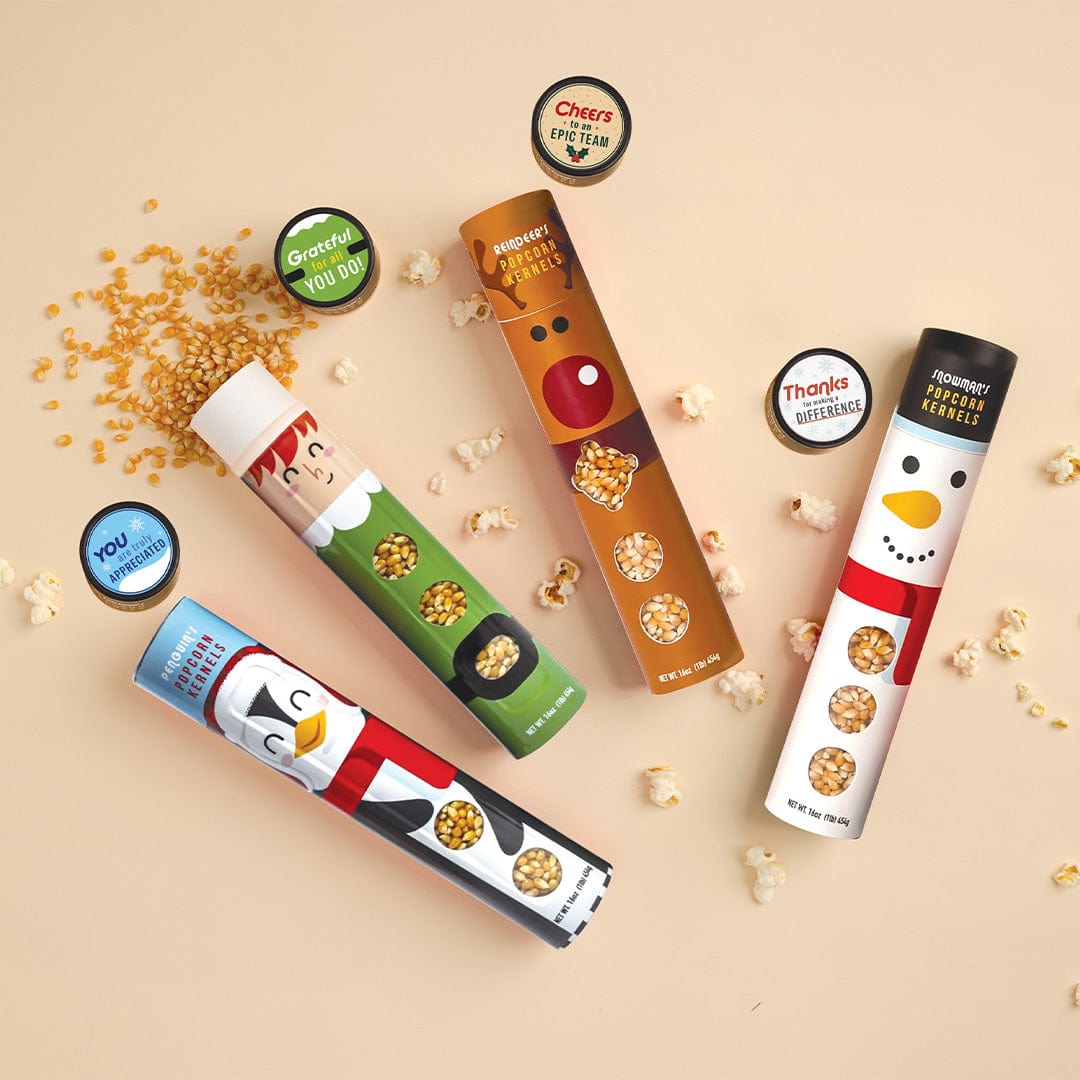 Spread cheer and appreciation with Baudville’s Joyful Holiday Popcorn Character Collection Snowman— jolly and bright way to celebrate the season. Whether you're looking for a quick last-minute gift or a festive treat to thank your team, this ready-to-gift set delivers joy in every kernel.