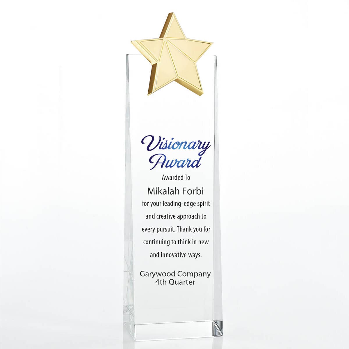 Award incredible achievements with the Crystalline Tower Trophy! Crafted with quality crystal, this trophy is printed in full color from the back. Select a prewritten verse and add your own customization to make it truly one-of-a-kind. Comes displayed in an elegant Baudville exclusive box. Perfect for end-of-year awards and everyday employee appreciation.
