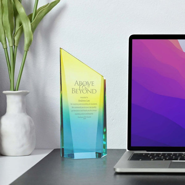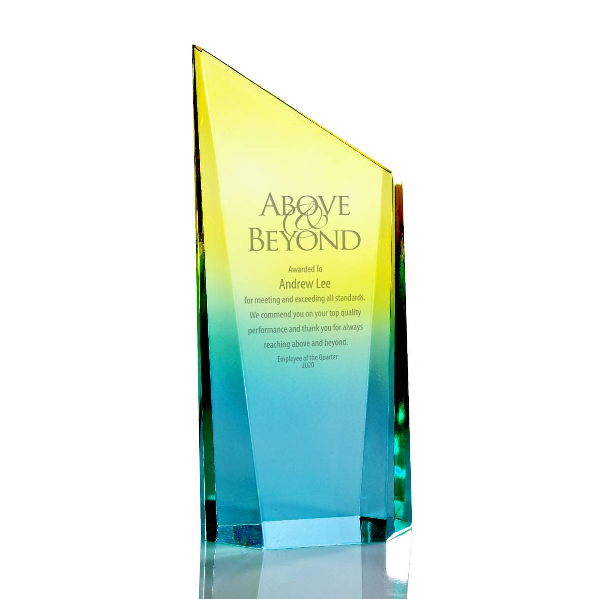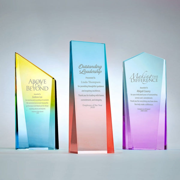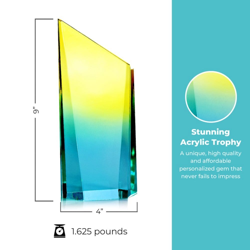 Each trophy in the collection is crafted from durable acrylic and designed for full personalization—perfect for year-end recognition awards, milestone achievements, or peer-nominated honors. The ombre finish adds depth and color without distracting from your engraved message.