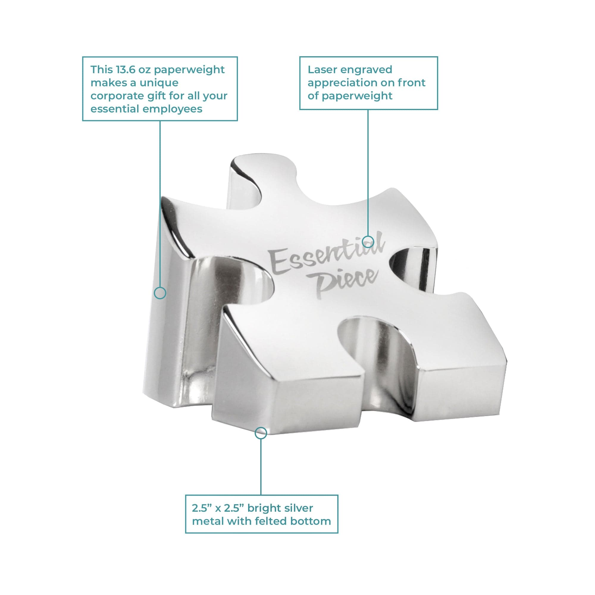 A Baudville exclusive, this shiny puzzle piece paperweight makes a unique corporate gift for all your indispensable employees. Each silver puzzle piece is laser engraved with the popular "Essential Piece" message.
