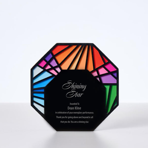 Celebrate your top achievers with the Radiant Recognition Trophy - Octagon, a standout trophy designed to honor success in style. Part of the exclusive Radiant Recognition collection, this employee recognition award takes inspiration from stained glass, featuring bold shades of blue, orange, and pink in a striking octagon shape. Crafted from metal and acrylic, it is both durable and visually stunning. Personalize this unique trophy with a logo, name, or message to create a keepsake that reflects your team’s accomplishments. Delivered in a sleek, presentation-ready display box, this acrylic trophy is perfect for milestones, executive honors, and corporate programs.