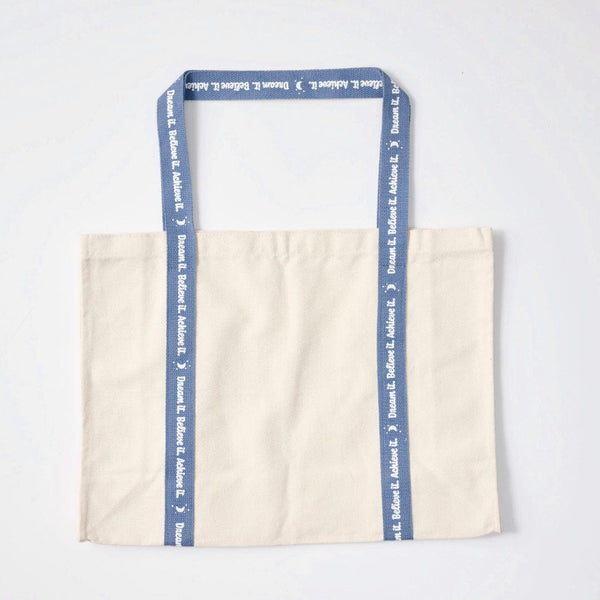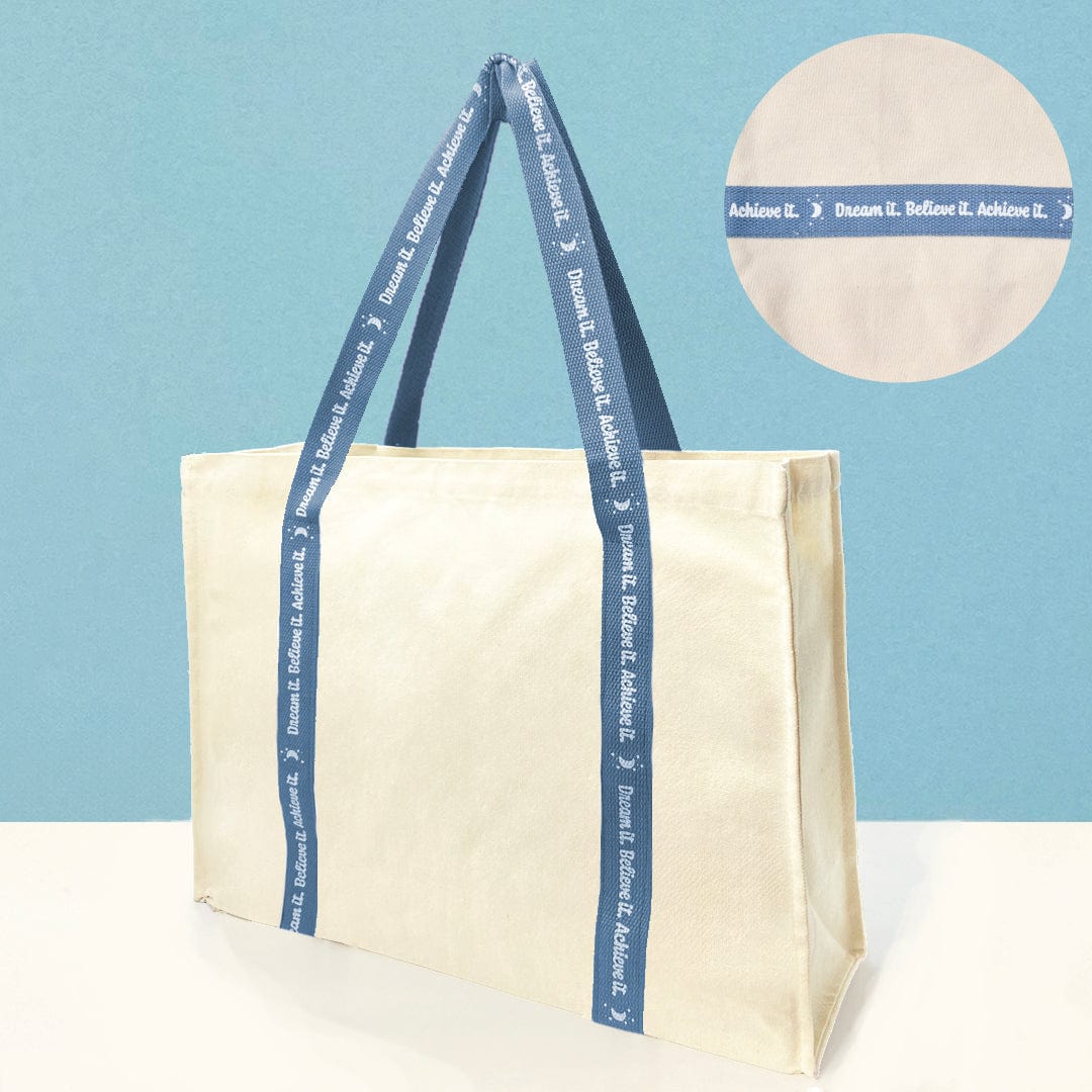 Introducing the Trader's Natural Tote Bag - Dream It, a stylish and versatile tote that combines modern flair with timeless appeal. Inspired by the beloved Trader Joe’s aesthetic, this bag features a crisp white cotton body accented with a light blue strap. The strap isn't just for carrying; it’s an inspiration in itself, with a repeating design that reads, "dream it, believe it, achieve it." This tote is more than just a bag—it’s a message of motivation your team can carry wherever they go!