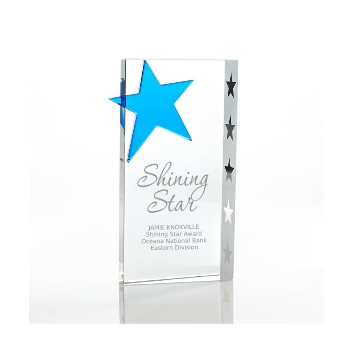 This 4 x 8" tall crystal trophy with blue star accent makes a stunning award for their desktop. Small stars run down the frosted right... Read More